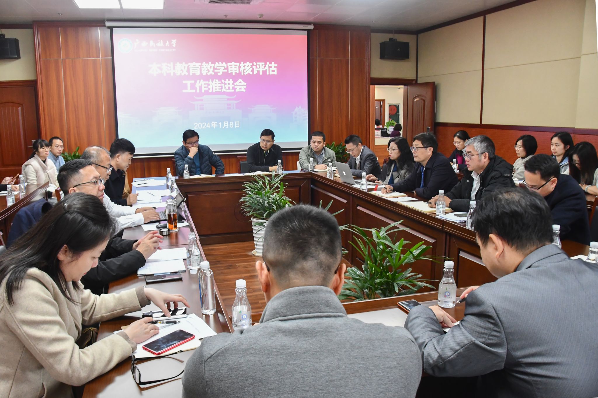 【大学生通讯社报道】1月8日至12日,beat365分别在武鸣校区、思源湖校区、相思湖校区召开本科教育教学审核评估工作推进会。党委常委、副校长、评估办主任姜明国出席会议。教务处处长、评估办副主任王新哲,各本科学院党委书记、院长、分管教学副院长、教学秘书,学校督查室领导,以及学校评估办全体人员参会。