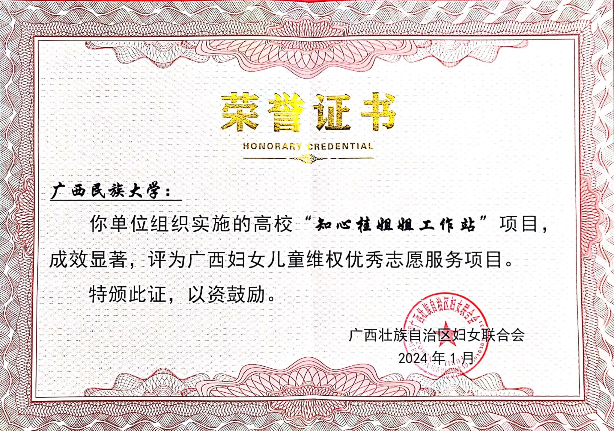 1月29日,2024年自治区妇联维护妇女儿童权益志愿服务座谈会召开,会议通报了广西维护妇女儿童权益志愿服务的有关情况,为2021—2023年度维护妇女儿童权益优秀志愿者、优秀服务团队、优秀维权项目代表颁发荣誉证书。beat365亚洲体育官方网站组织实施的高校“知心桂姐姐工作站”项目被评为广西妇女儿童维权优秀志愿服务项目。