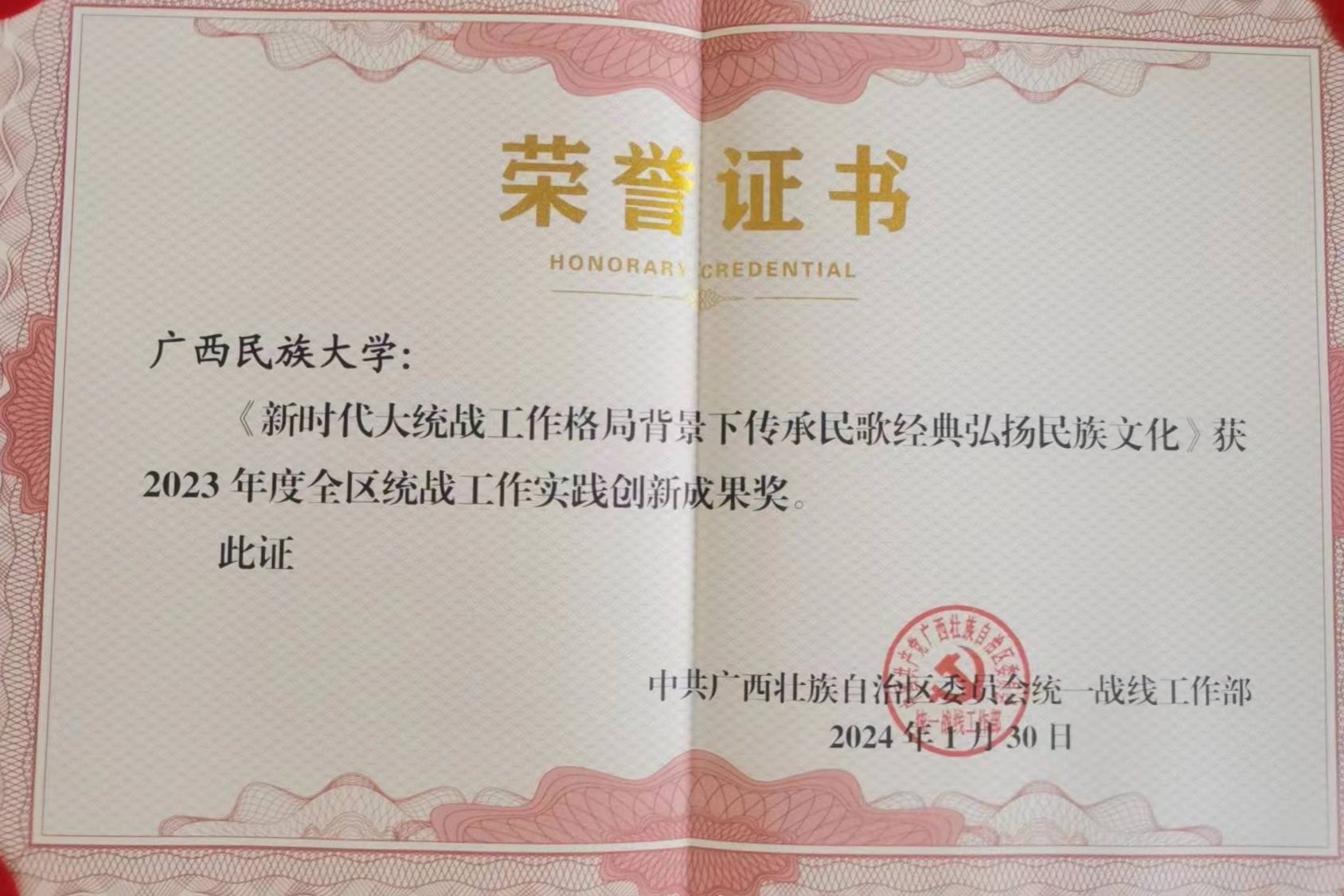 beat365亚洲体育官方网站《新时代大统战工作格局背景下传承民歌经典弘扬民族文化》项目获2023年度全区统战工作实践创新成果奖