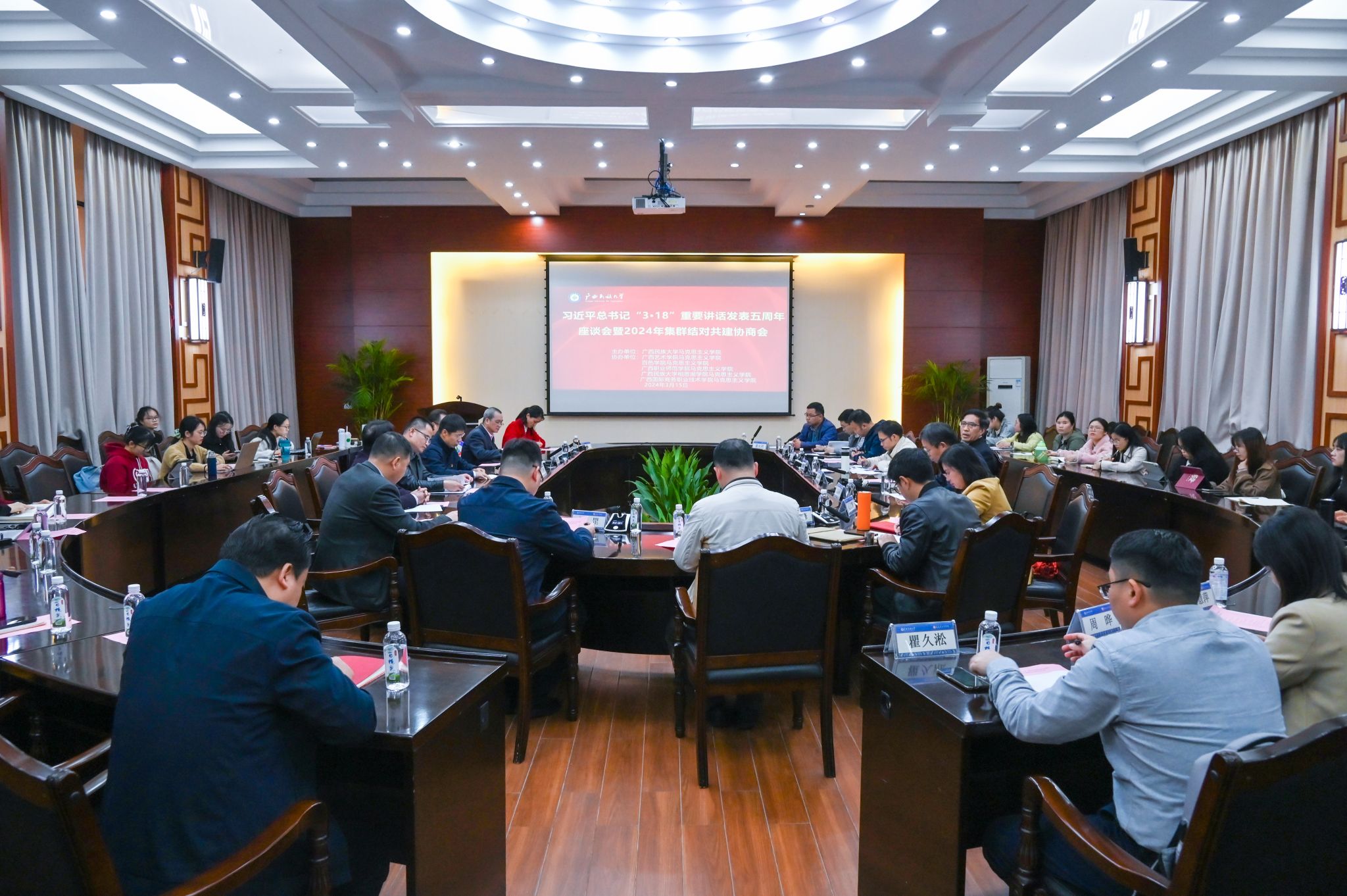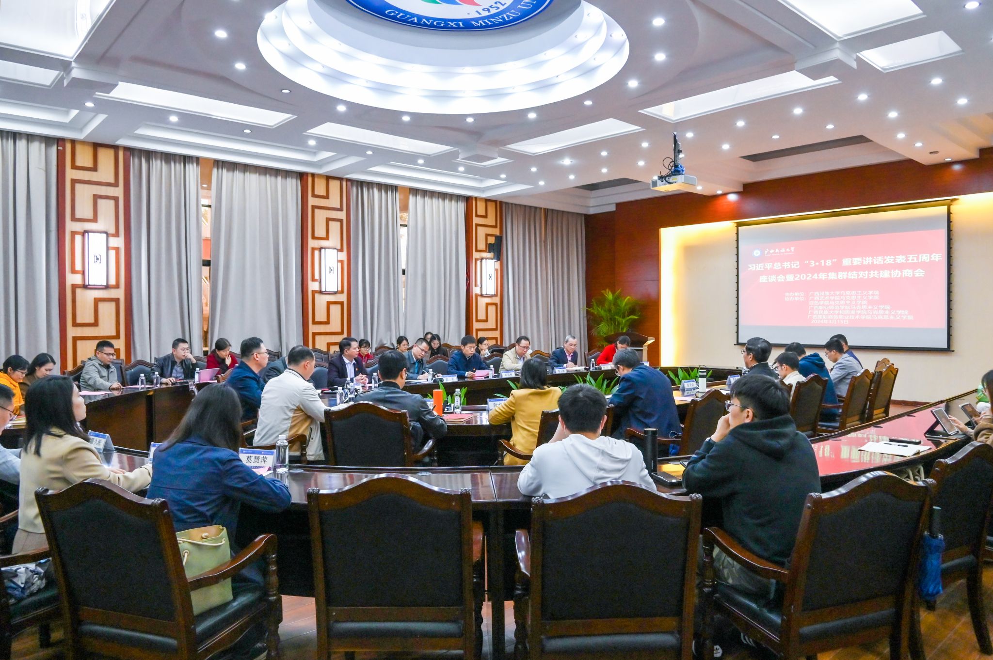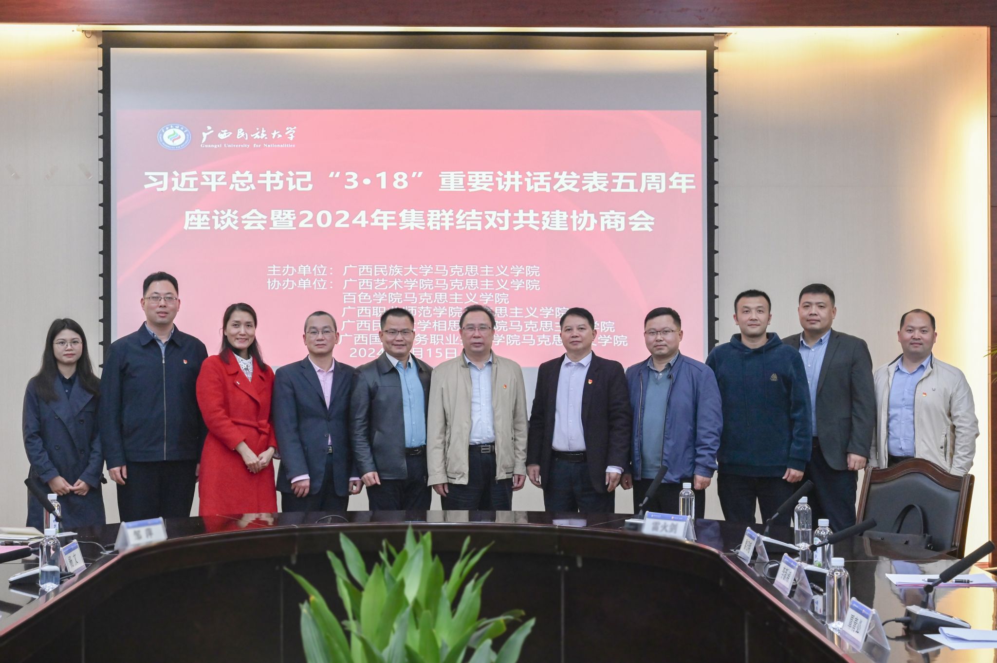 【大学生通讯社报道】3月15日下午,beat365亚洲体育官方网站在国际合作与交流处大会议室召开习近平总书记“3•18”重要讲话发表五周年座谈会暨2024年集群结对共建协商会。beat365亚洲体育官方网站党委副书记邓国彬出席会议。百色学院、广西艺术学院等区内高校马克思主义学院专家学者及beat365马克思主义学院师生代表与会。