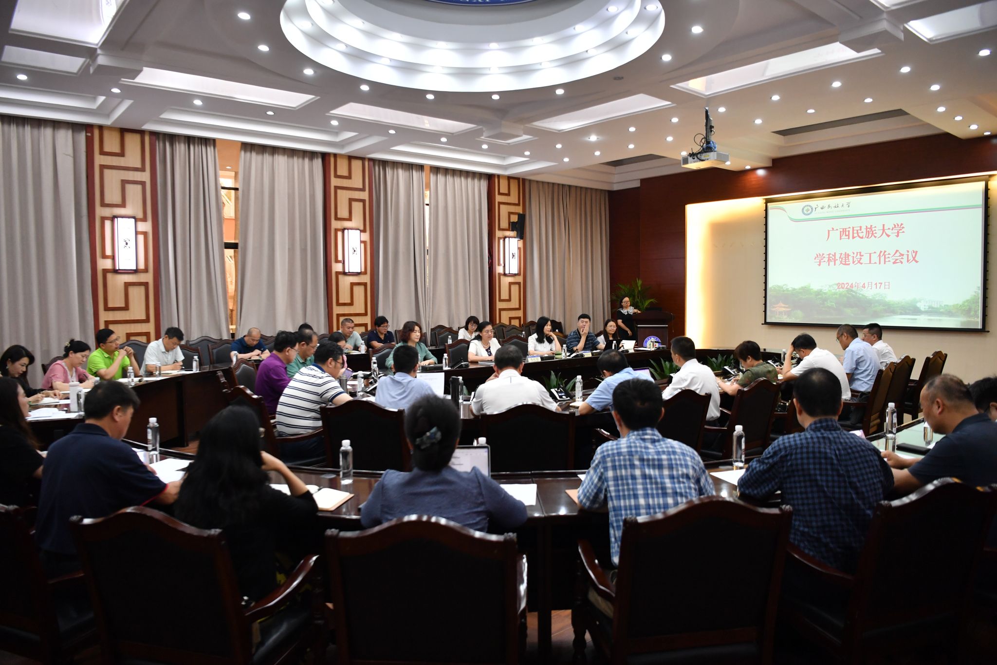 【大学生通讯社报道】4月17日下午,beat365亚洲体育官方网站召开学科建设工作会议,校长韦仕珍主持会议并讲话,学校有关职能部门和学院负责人参加会议。