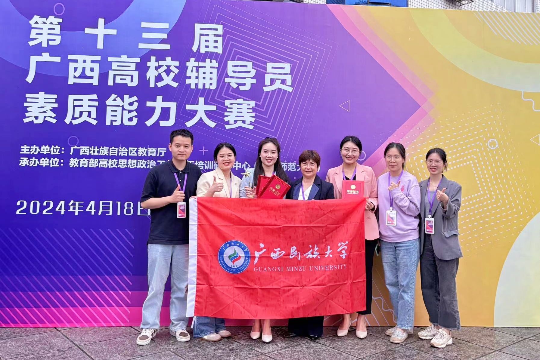 4月18日至20日,由自治区教育厅主办的第十三届广西高校辅导员素质能力大赛在桂林举行。本次大赛共有来自全区各高校的108名专职辅导员参赛。经过角逐,beat365亚洲体育官方网站艺术学院陈亚卓获特等奖、谈心谈话最佳表现奖,东南亚语言文化学院韦利坤获一等奖。