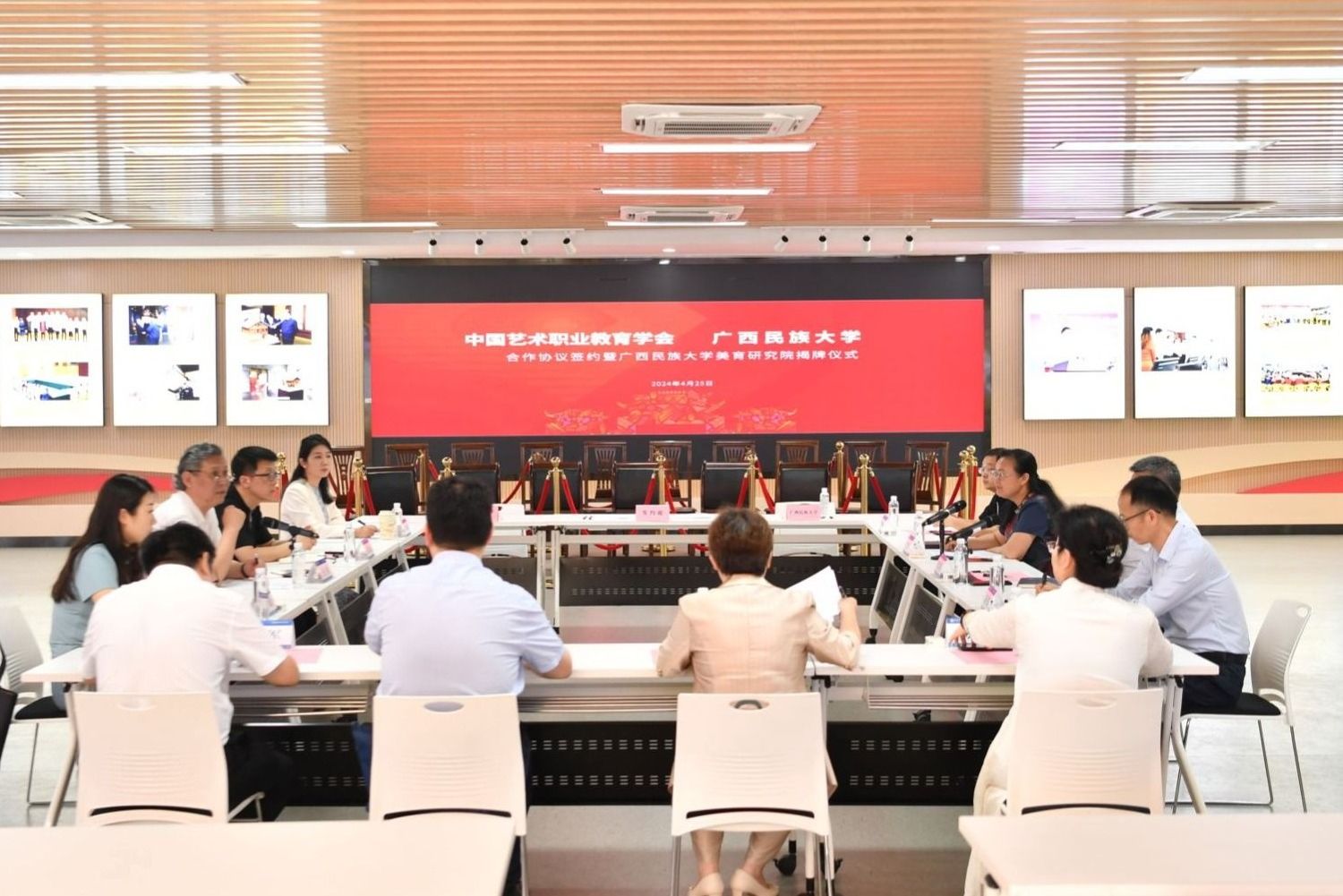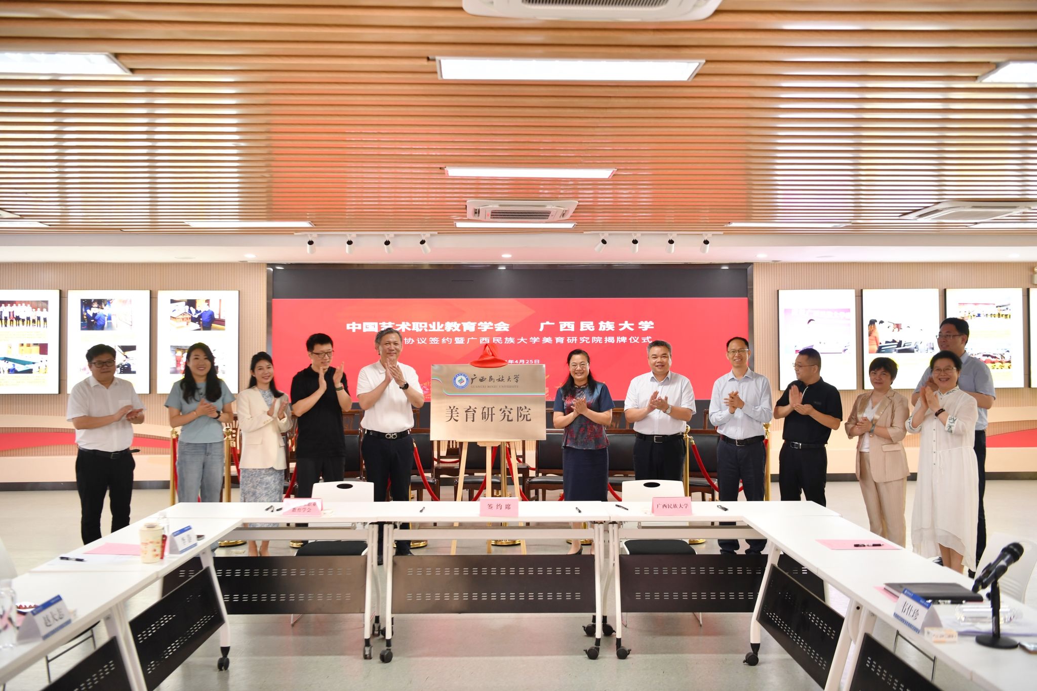【大学生通讯社报道】4月25日上午,beat365亚洲体育官方网站美育研究院揭牌仪式在新时代“我与祖国共成长”党团主题活动文明实践所举行。beat365亚洲体育官方网站校长韦仕珍,中国艺术职业教育学会会长王丰签订合作框架协议,共同为beat365亚洲体育官方网站美育研究院揭牌。校党委副书记陈铭彬主持活动。