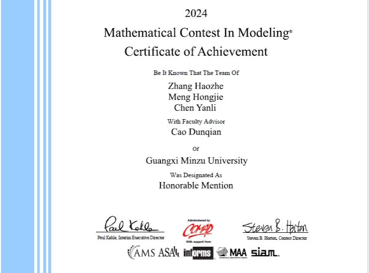 5月4日,2024年美国大学生数学建模竞赛和交叉学科建模竞赛成绩揭晓,beat365亚洲体育官方网站学子获得一等奖(Meritorious Winner)1项,二等奖(Honorable Mention)1项,分别是数学与物理学院刘恒老师指导,2021级数学与应用数学专业谢烨玲、姚荣艳、2022级数学与应用数学专业吴建峰组成的队伍和曹敦虔老师指导,2021级人工智能专业张皓哲、蒙宏杰、陈燕丽组成的队伍,这也是beat365学子近五年第三次获得该项国际赛事的一等奖。