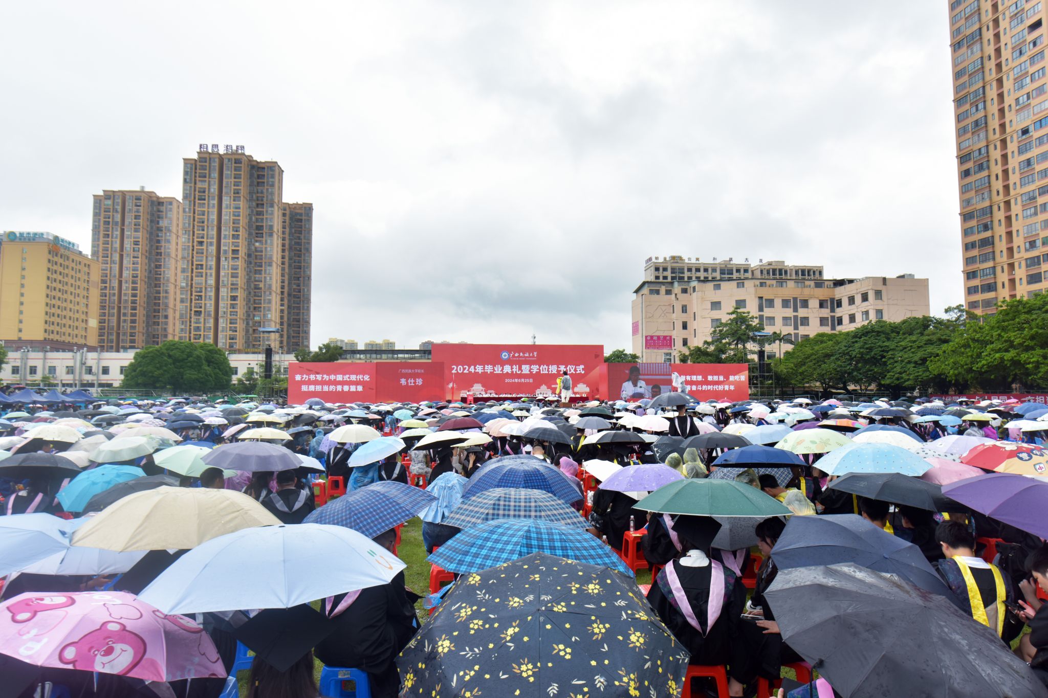 4000余名毕业生正衣冠庄重迎接毕业盛典。由韦仕珍为优秀毕业生代表拨穗、由学校及学院学位评定委员会组成的导师团为毕业生拨穗并合影留念。