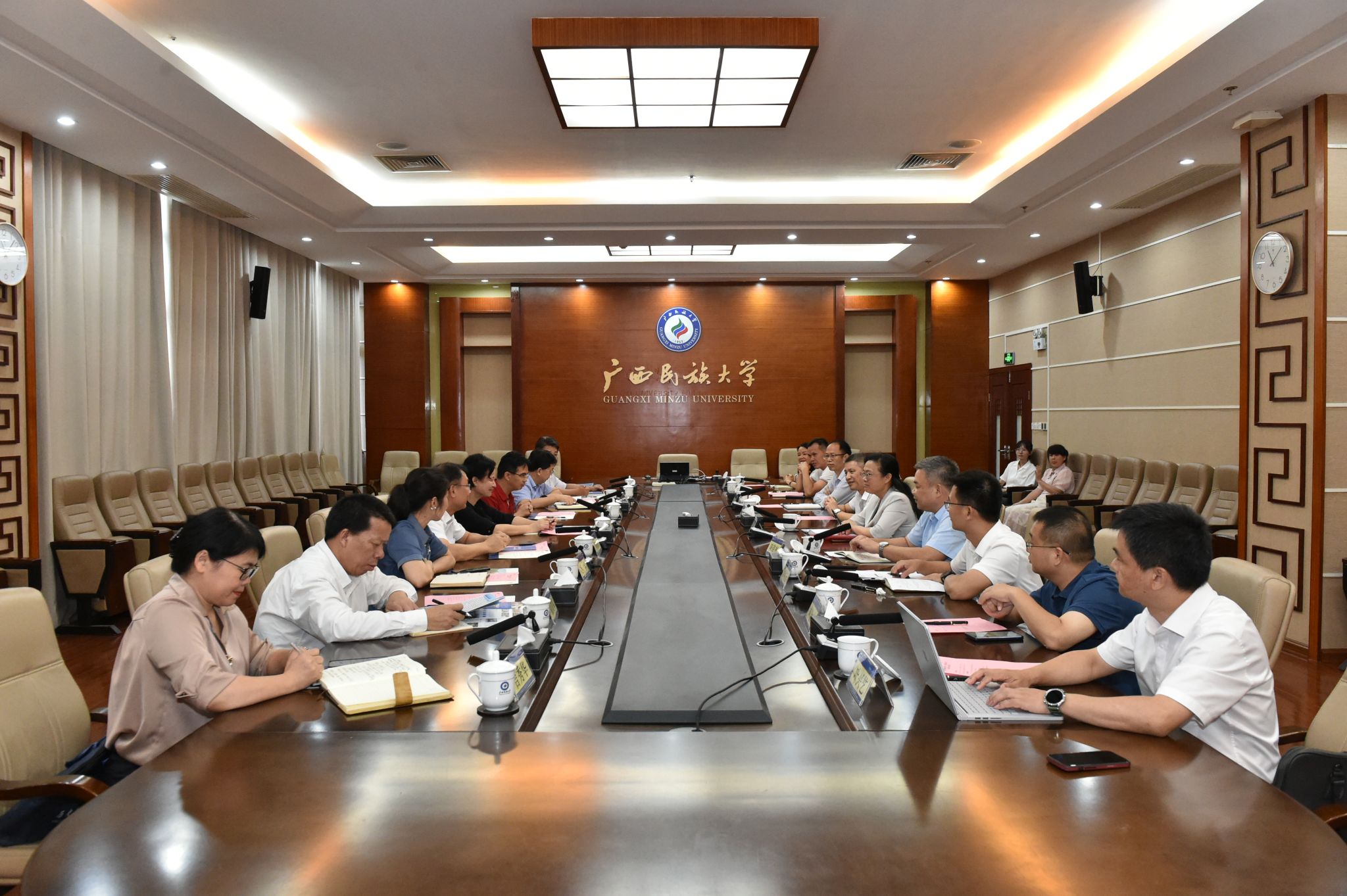 双方就党建、干部队伍建设、依法治校、新媒体运营和校园文化建设、铸牢中华民族共同体意识、面向东盟人才培养和留学生教育、后勤、基建、保卫等工作进行了交流。两校有关职能部门和学院负责人参加会议。