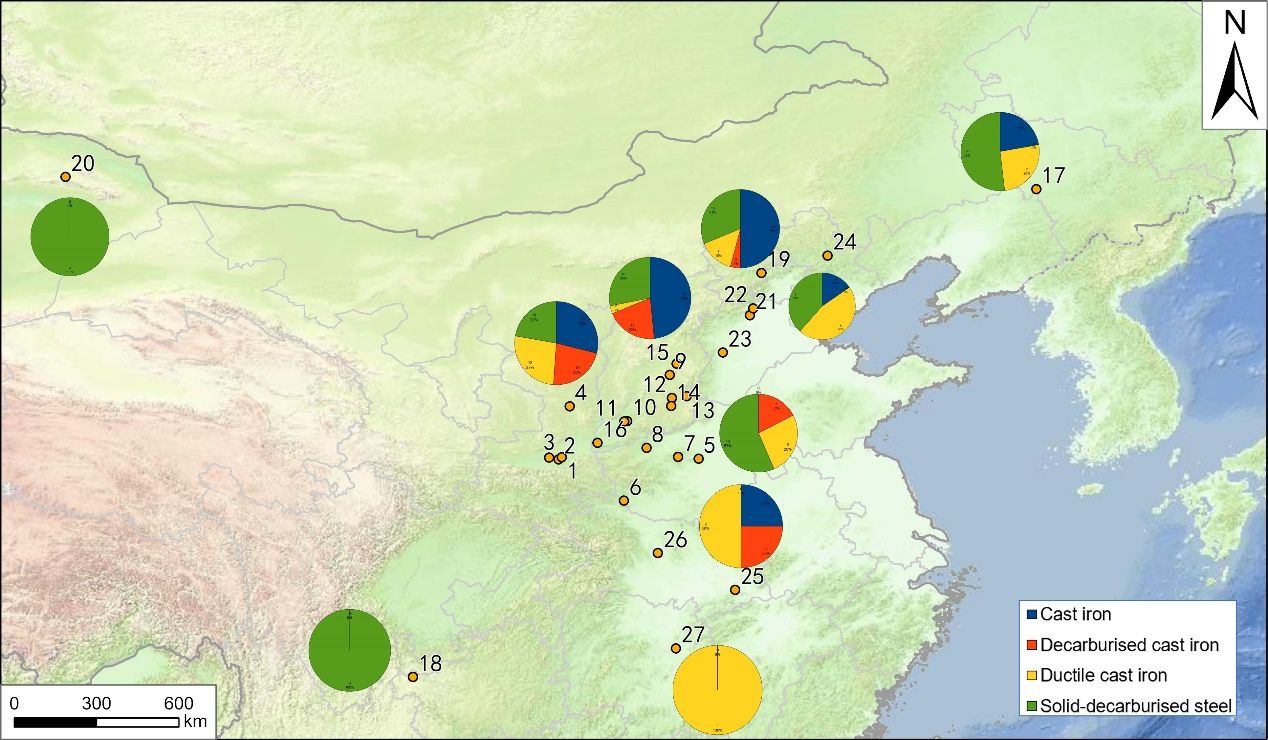 山西榆社偶尔坪遗址是近年来晋中发掘的一处重要的战国时期遗址。该研究对偶尔坪遗址出土铁器的科技考古分析,结果显示铁器材质分为两类:铸造生铁和生铁脱碳制品。其中,铸造生铁制品为过共晶白口铁,生铁退火脱碳制品包括脱碳铸铁、铸铁脱碳钢(熟铁)及韧性铸铁。结合各铁器出土年代表明,该遗址从战国中期开始使用铁器,且已大规模使用生铁退火脱碳技术,已可制作铸铁脱碳钢。结合遗址铁器窖藏及建筑基址营造情况,表明其铁器生产量已达到一定的规模。对该遗址铁器的研究,不仅揭示了该地区铁器生产的技术内涵,同时对研究该地区乃至中国古代制钢技术的发展具有十分重要的作用。