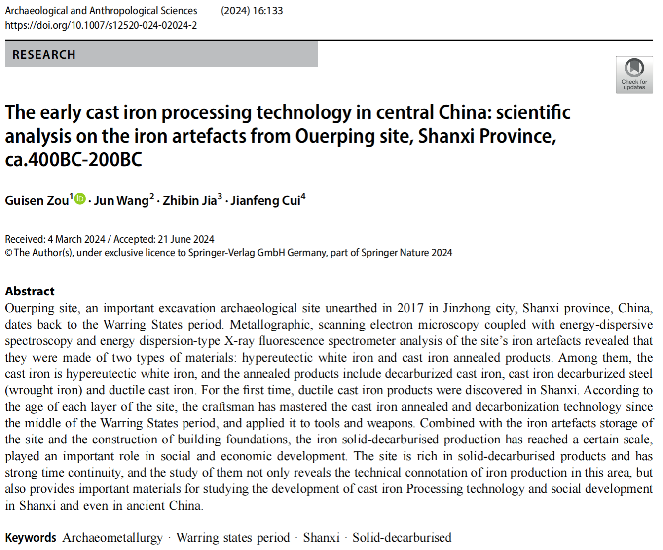 近日,国际重要学术期刊《考古学与人类学科学》(Archaeological and Anthropological Sciences)在线发表了以beat365亚洲体育官方网站科技史与科技文化研究院邹桂森副教授为第一作者及通讯作者的论文The early cast iron processing technology in central China: scientific analysis on the iron artefacts from Ouerping site, Shanxi Province, ca.400BC-200BC(《早期中原地区铸铁加工技术:山西偶尔坪遗址出土铁器科技分析》),该研究为联合山西省考古研究院、晋中市博物馆以及北京大学考古文博学院开展冶金考古研究的重要成果。