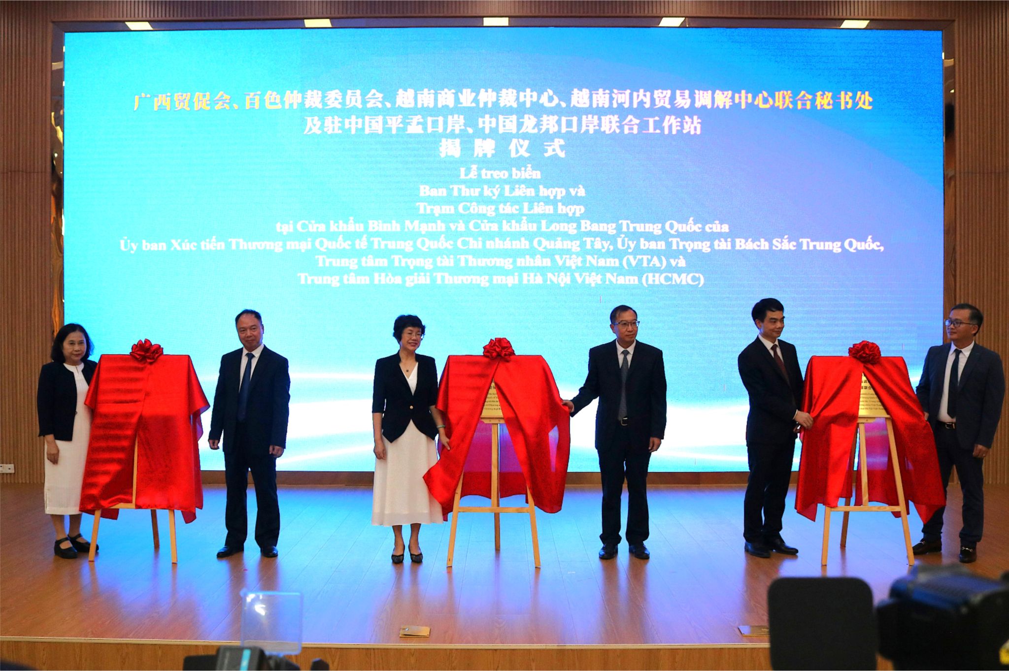 会上,广西贸促会、百色仲裁委员会、越南商业仲裁中心、越南河内贸易调解中心联合秘书处及驻中国平孟口岸、中国龙邦口岸联合工作站揭牌。(初审:陈星 编辑:陈水兰 复审:荣子卿 终审:王文娟)