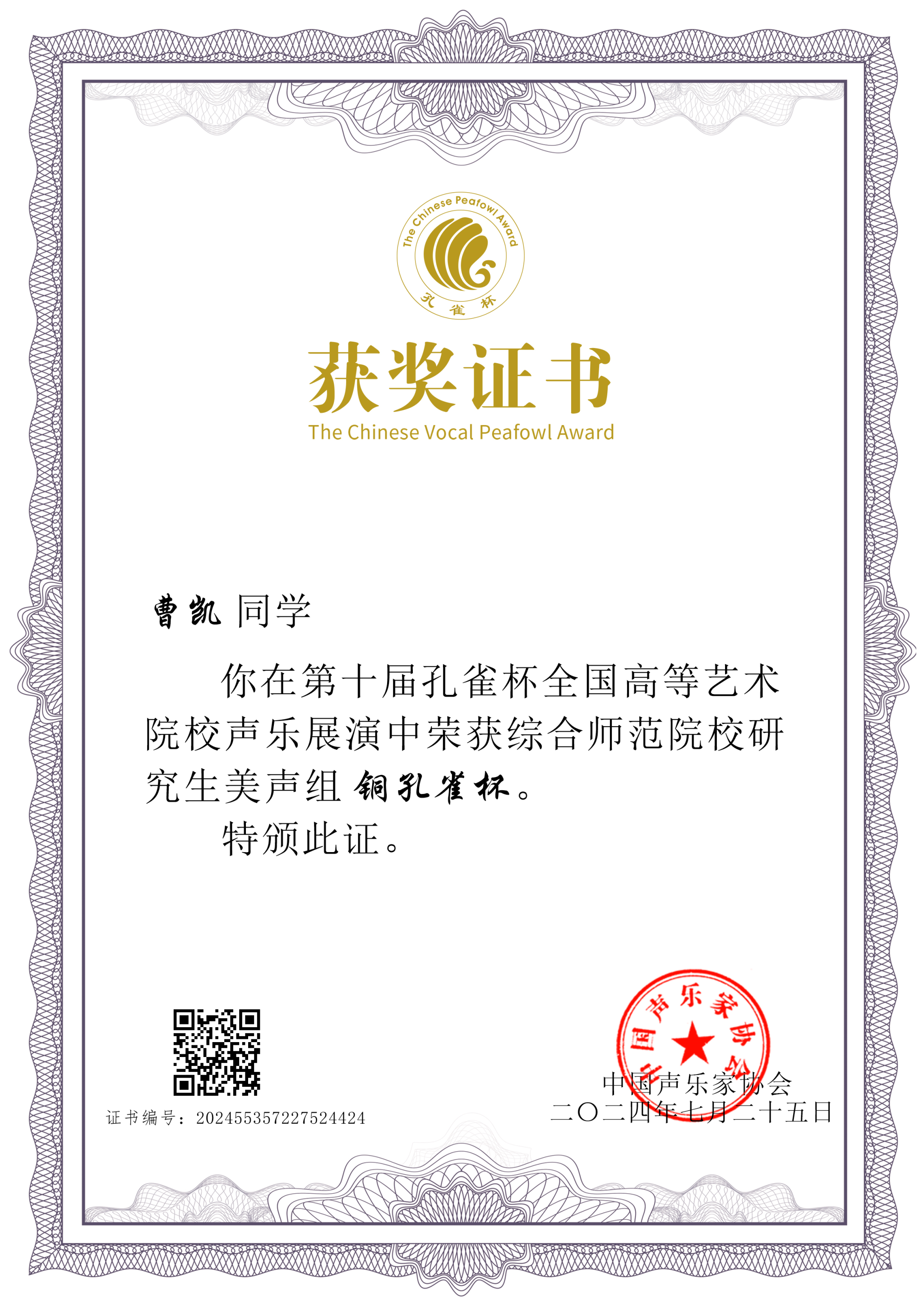 曹凯演唱曲目《不答应也得答应》获铜孔雀杯