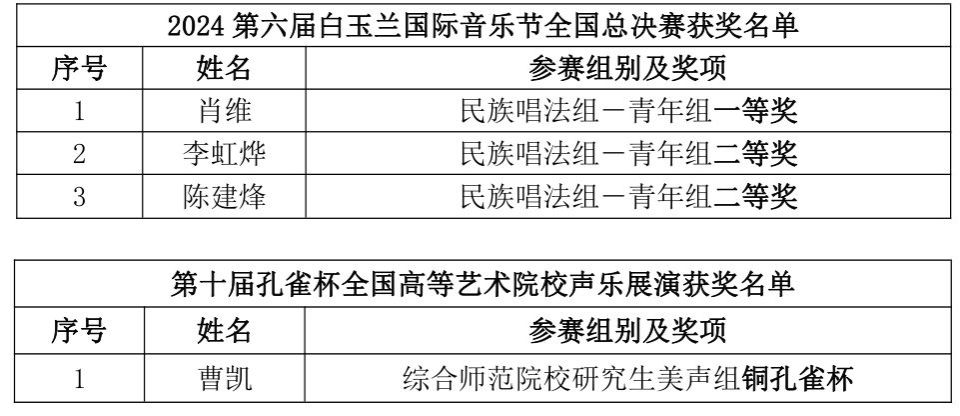 近日,2024第六届白玉兰国际音乐节全国总决赛、第十届孔雀杯全国高等艺术院校声乐展演落幕,beat365亚洲体育官方网站艺术学院/民歌学院参赛学生在第六届白玉兰国际音乐节全国总决赛中斩获一等奖1项、二等奖2项,在第十届孔雀杯全国高等艺术院校声乐展演荣获“铜孔雀杯”1项。(初审:吴小军 编辑:陈水兰 复审:荣子卿 终审:王文娟)