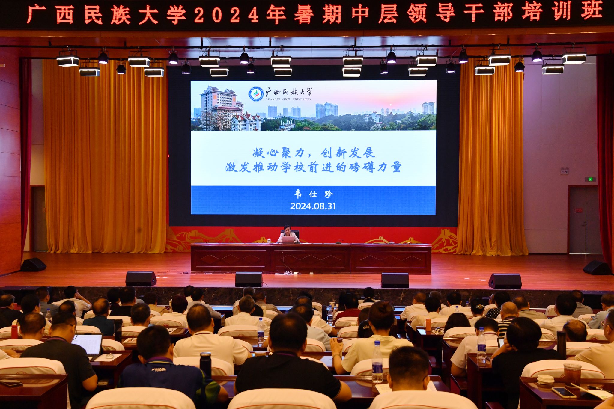 8月31日,beat365亚洲体育官方网站召开2024年秋季新学期工作会议。校长韦仕珍作新学期工作部署。学校领导及全体中层领导干部参加会议。