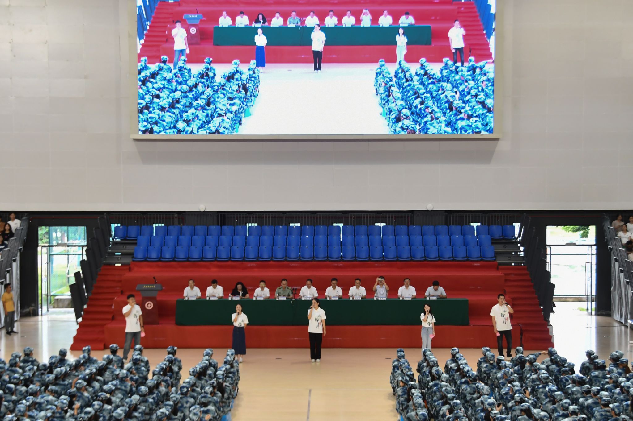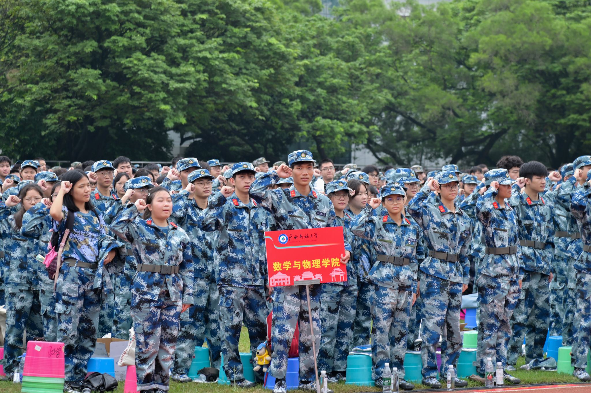 校党委副书记陈铭彬、邓国彬,党委常委、副校长何立荣分别主持相思湖校区、思源湖校区、武鸣校区军训动员大会。校领导指出,军事技能训练不仅是大学生涯中的一门必修课,更是塑造坚韧意志、培养团队精神、增强国防意识的重要途径。希望军训新生坚定理想信念,学习革命先辈“流血流汗不流泪”的精神,刻苦参训,练就钢铁一般的信仰、信念、纪律和担当,把爱国情、强国志、报国行自觉融入建设社会主义现代化强国、实现中华民族伟大复兴的奋斗中。