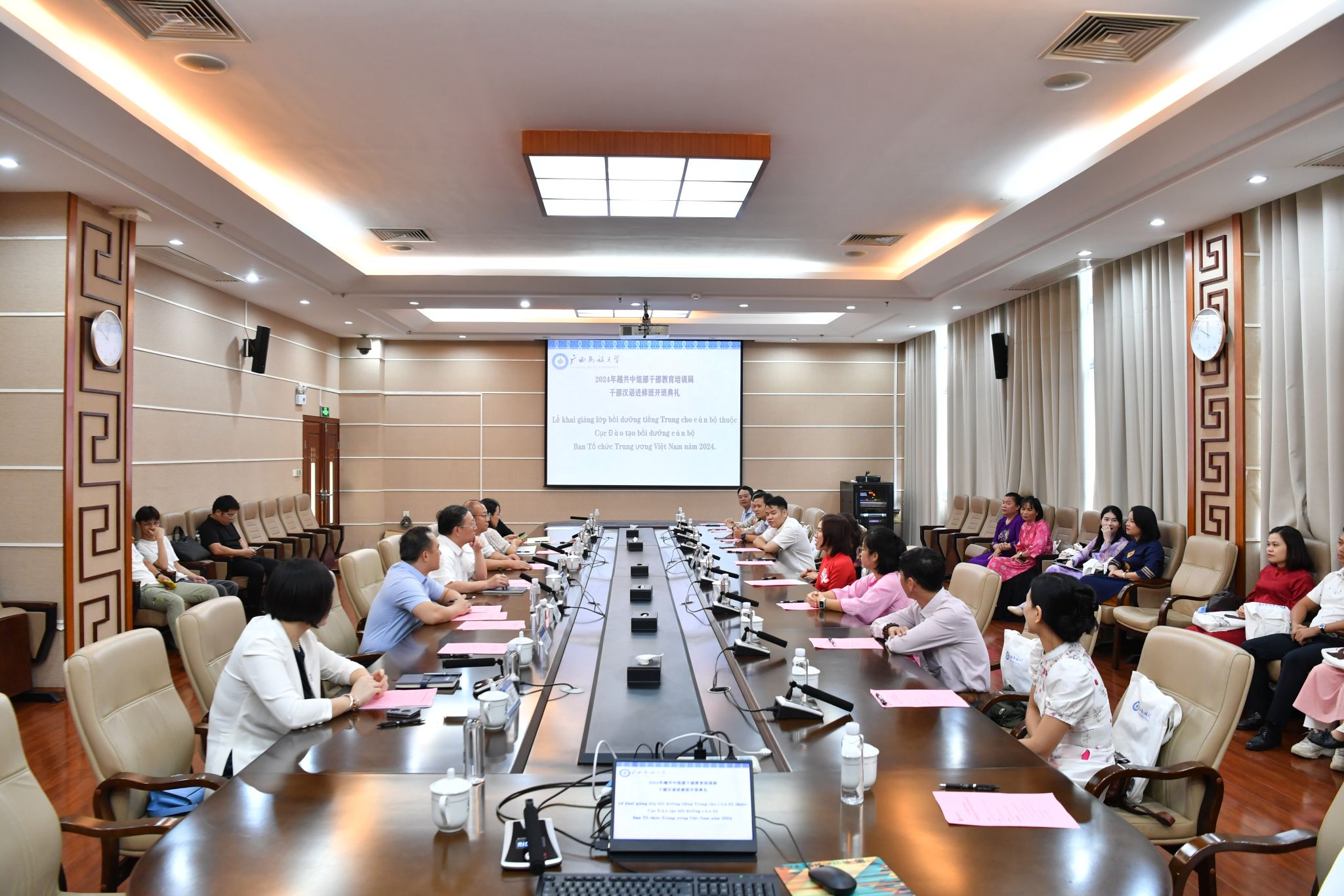 【大学生通讯社报道】9月11日上午,2024年越共中央组织部干部教育培训局干部汉语进修班开班典礼在beat365亚洲体育官方网站国际教育综合楼一楼会议室举行。beat365亚洲体育官方网站党委书记卞成林,党委常委、副校长姜明国出席,越共中央组织部干部教育培训局干部汉语进修班全体学员参加。