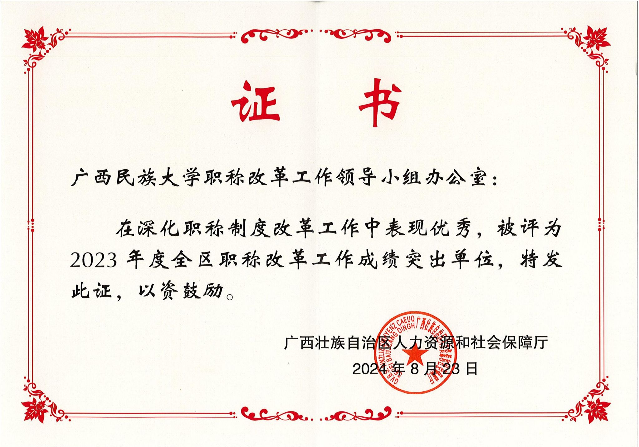 近日,自治区人力资源和社会保障厅印发《关于表扬2023年度全区职称改革工作成绩突出单位和个人的通知》,beat365亚洲体育官方网站职称改革工作领导小组办公室被评为“2023年度全区职称改革工作成绩突出单位”,这是beat365继2022年获评“2021年度全区职称改革工作先进单位”之后再获殊荣。