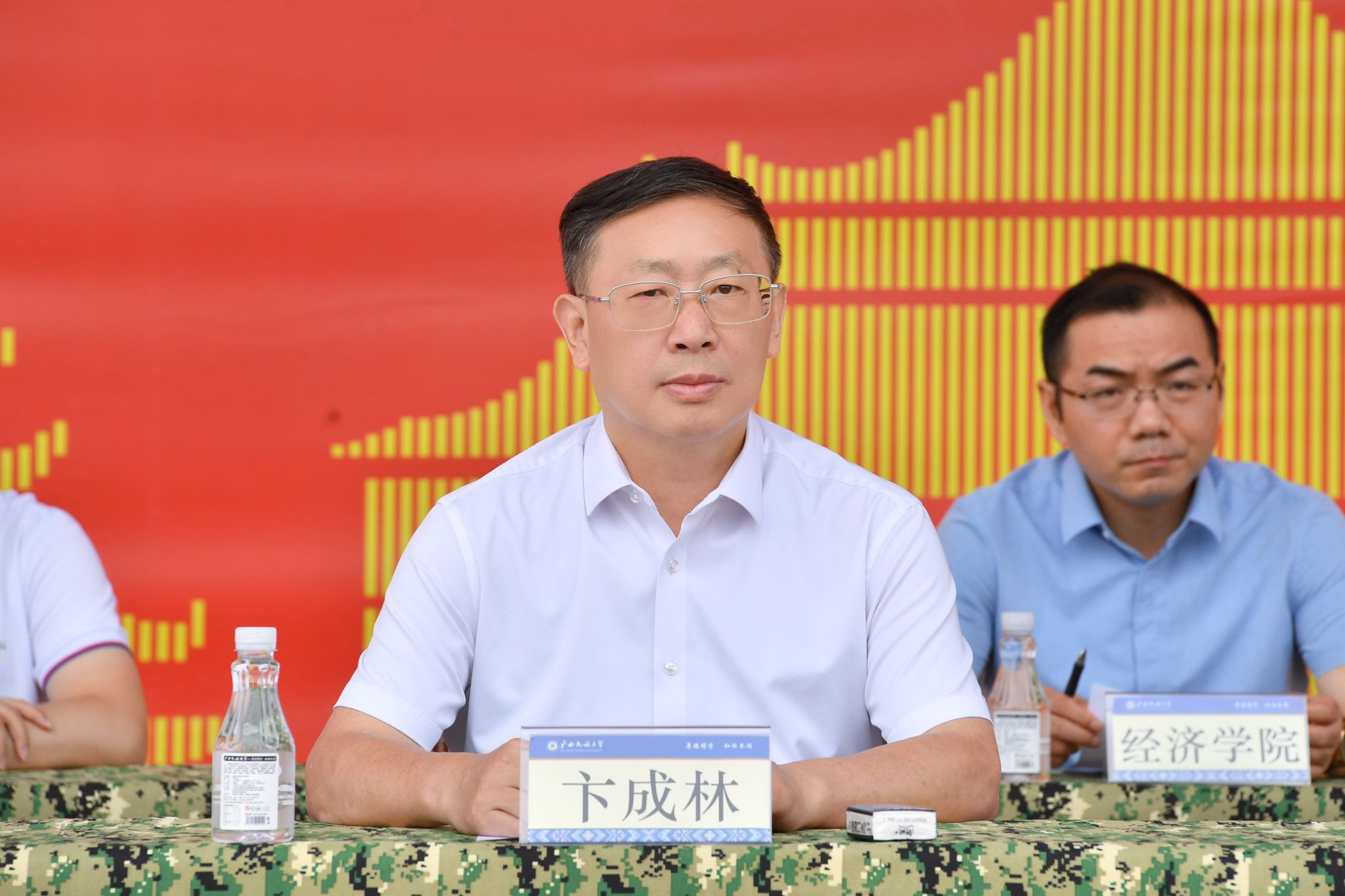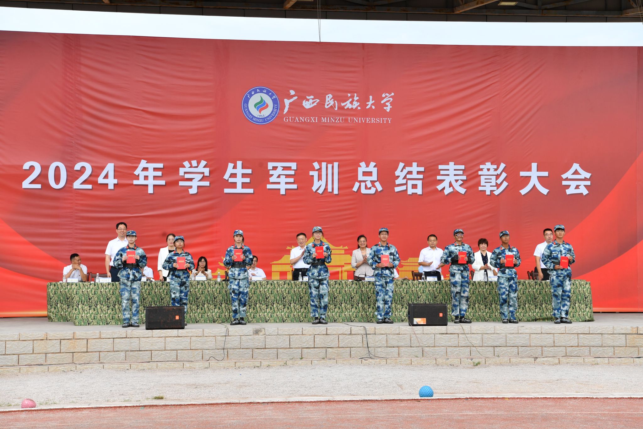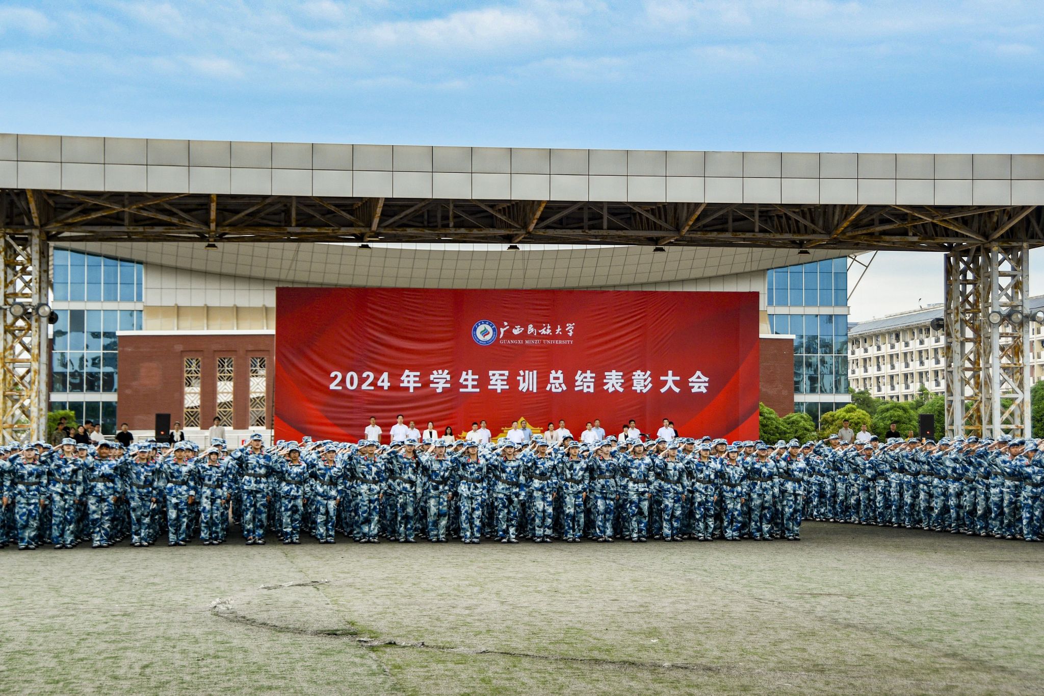 邓国彬、何立荣、姜明国分别主持思源湖校区、相思湖校区、武鸣校区军训总结表彰大会。校领导鼓励新生们发扬拼搏精神、提升本领能力、传承民大精神,奋力书写为中国式现代化挺膺担当的青春篇章。