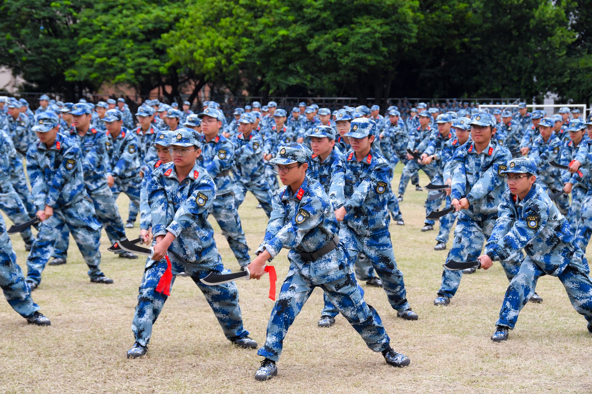 汇演总指挥教官整理好队伍后,面向主席台报告,学校领导指示:“按计划进行!”随着教官一声令下,现场气氛瞬间点燃。2024级参训新生依次进行分列式队列、刺杀操、大刀操、匕首操、倒功拳、应急棍术、捕俘拳术、模拟战术等军事项目表演。