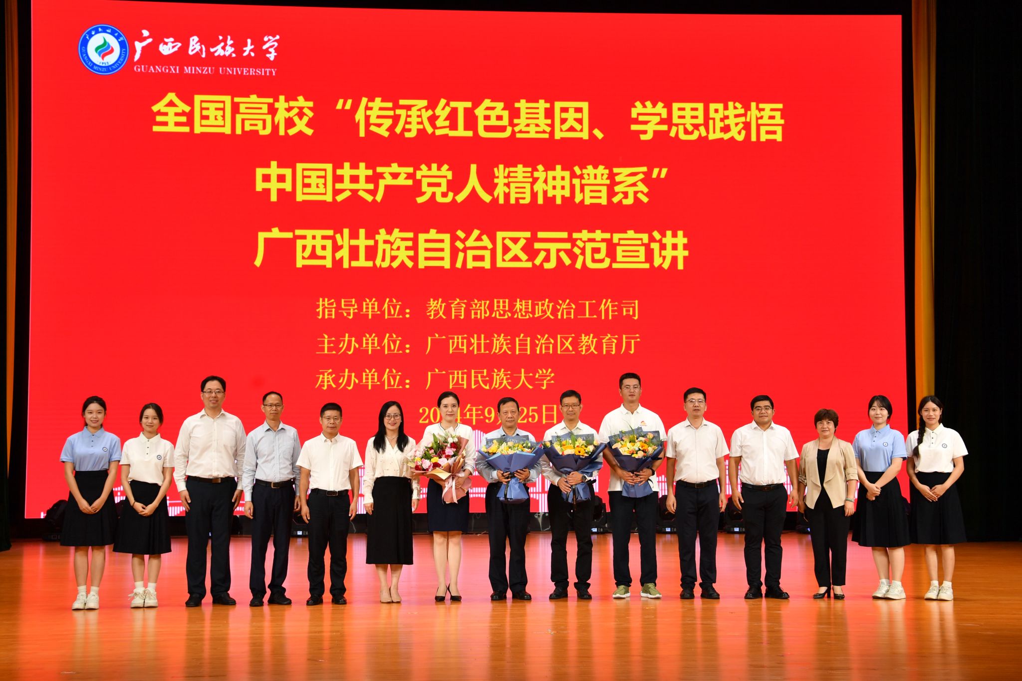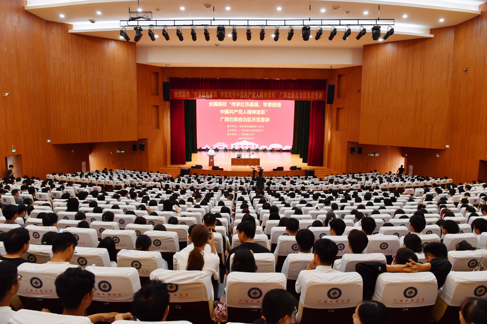 【大学生通讯社报道】9月25日,由教育部思政司指导,广西壮族自治区教育厅主办,beat365亚洲体育官方网站承办的全国高校“传承红色基因、学思践悟中国共产党人精神谱系”广西壮族自治区示范宣讲会在beat365亚洲体育官方网站思源湖校区大学生活动中心举行,宣讲团四位专家围绕“传承红色基因、学思践悟中国共产党人精神谱系”的主题作宣讲。beat365亚洲体育官方网站党委副书记邓国彬出席并致辞,教育部中国大学生在线副主任郑骊君,自治区党委教育工委宣传部副部长胡寿鹏,学校有关职能部门负责人、各学院师生代表近1000人参加宣讲会。