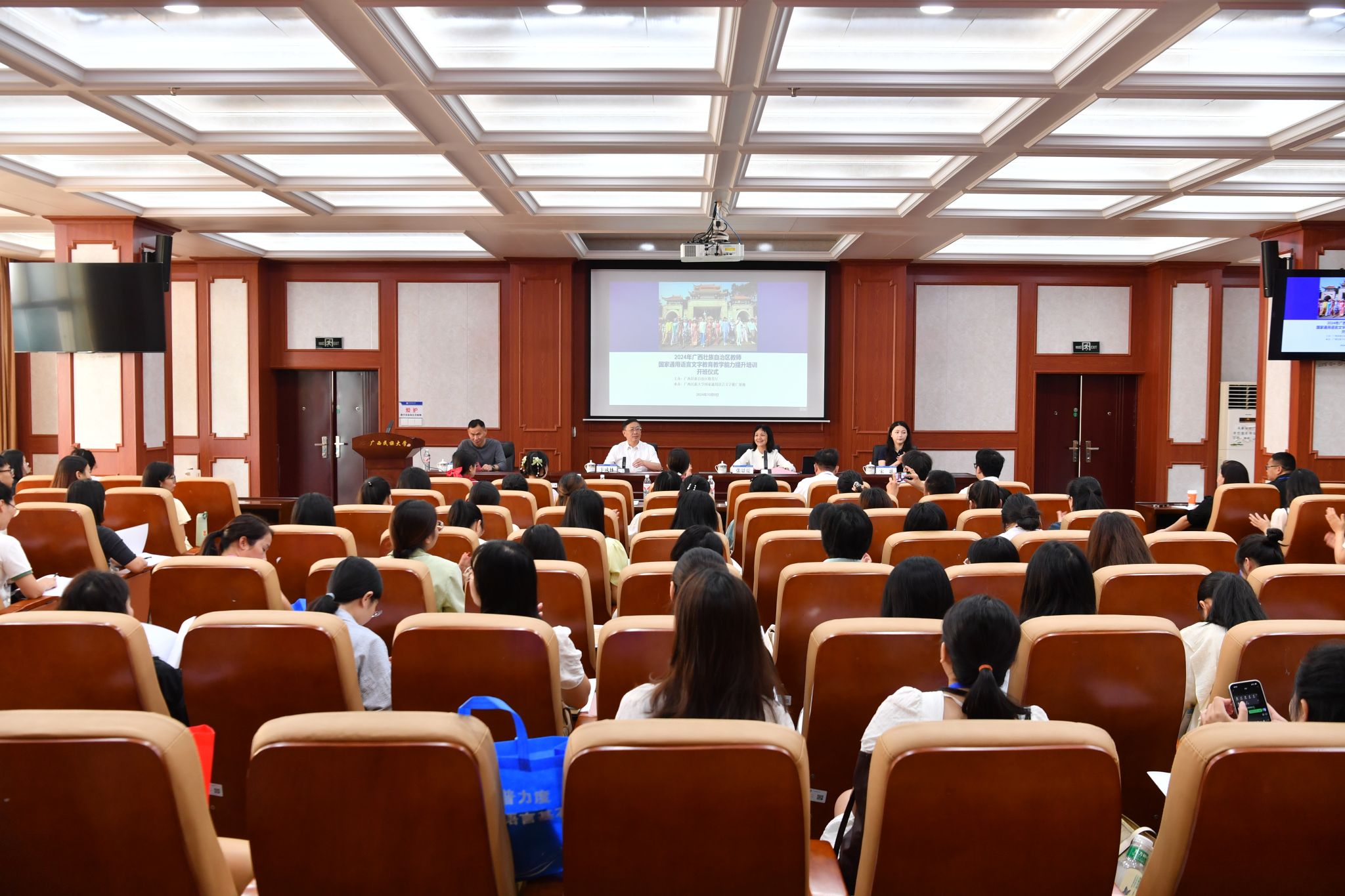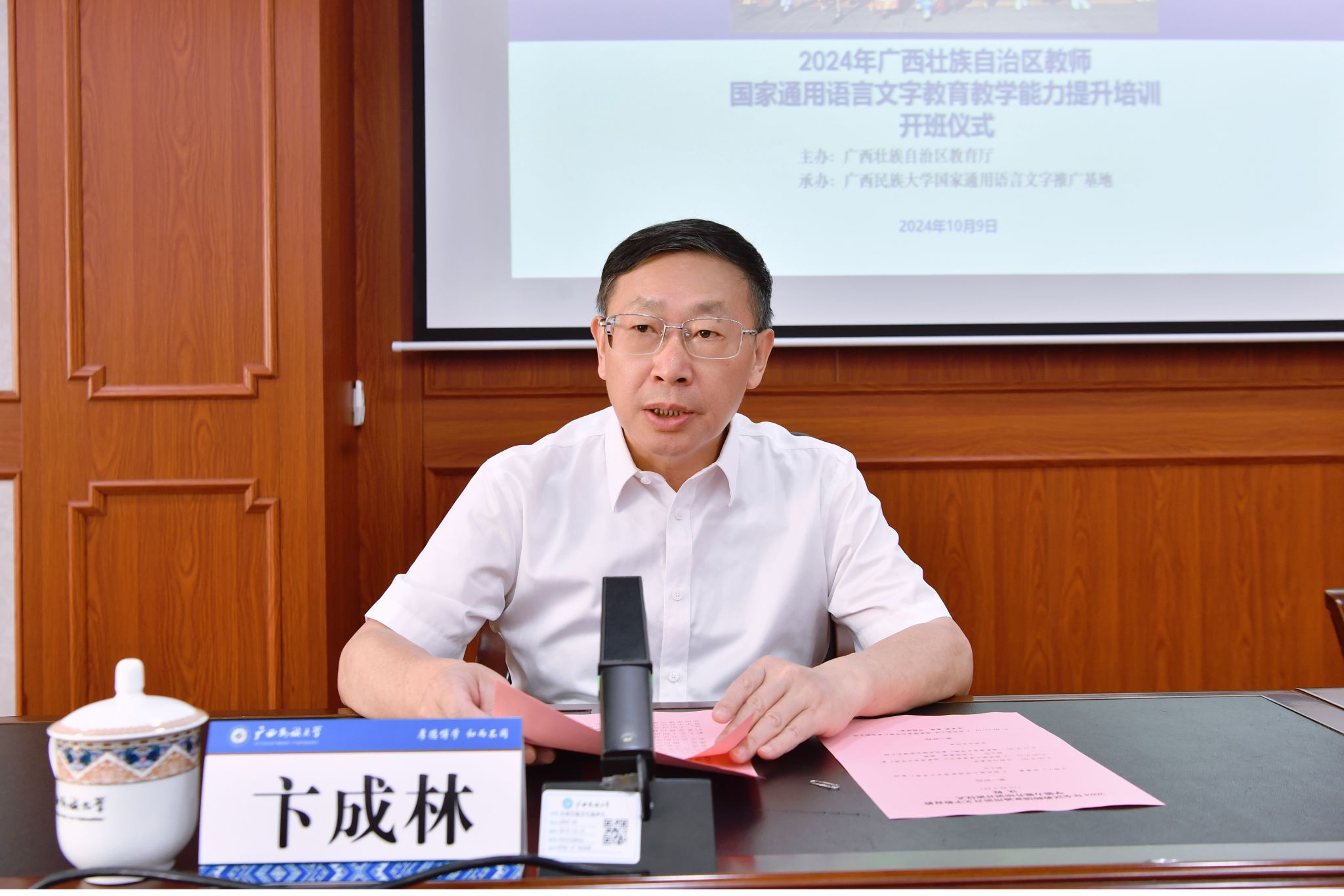 10月9日上午,2024年广西壮族自治区教师国家通用语言文字教育教学能力提升培训班(线下)在beat365亚洲体育官方网站开班。beat365亚洲体育官方网站党委书记、国家语言文字推广基地(beat365亚洲体育官方网站)主任卞成林教授出席开班仪式并讲话。全区中小学、幼儿园教师代表及参与管理、指导本地中华经典诵写讲活动骨干教师参加培训。