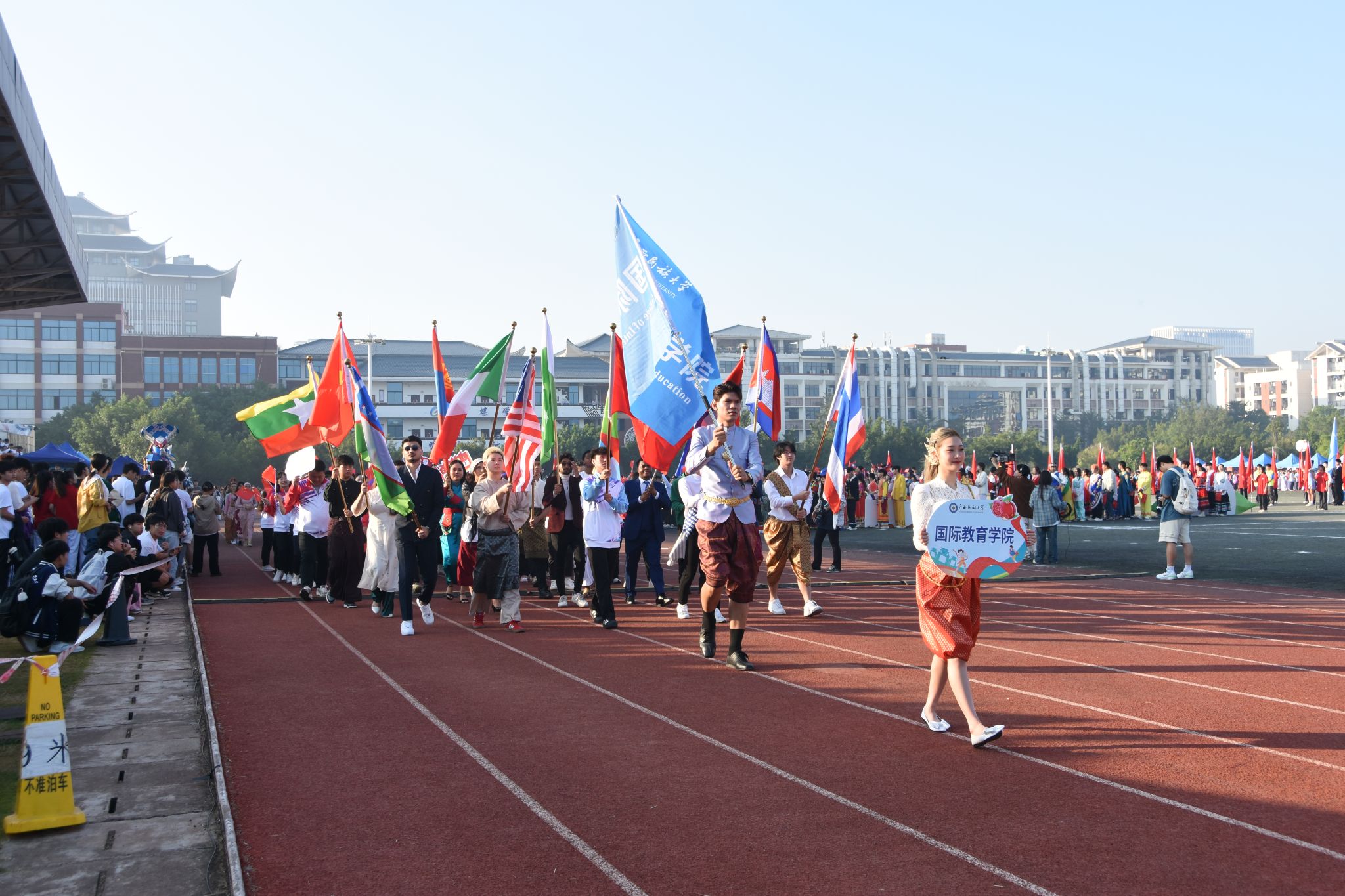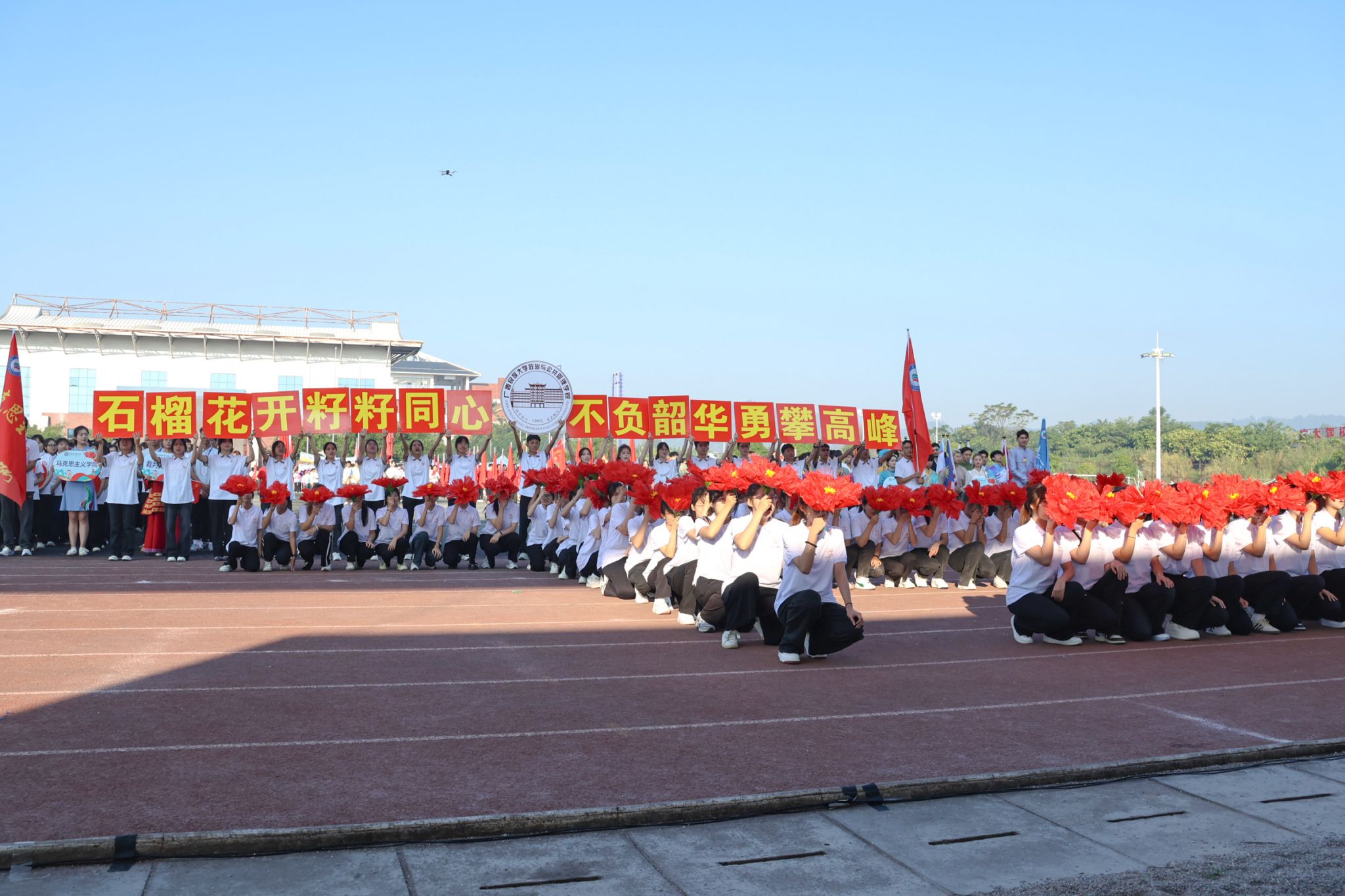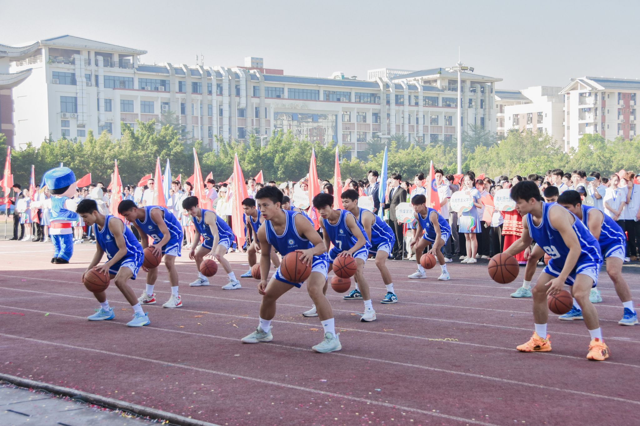 伴随着激昂的《运动员进行曲》,国旗方队、校旗方队、礼宾枪方块队、裁判员代表队、不同民族同学组成的红石榴方块队、各学院代表队意气风发依次入场,嘹亮的口号、精彩的表演传递出民大师生的青春风采,花样篮球、跳绳方队的花式表演为入场式更添活力。