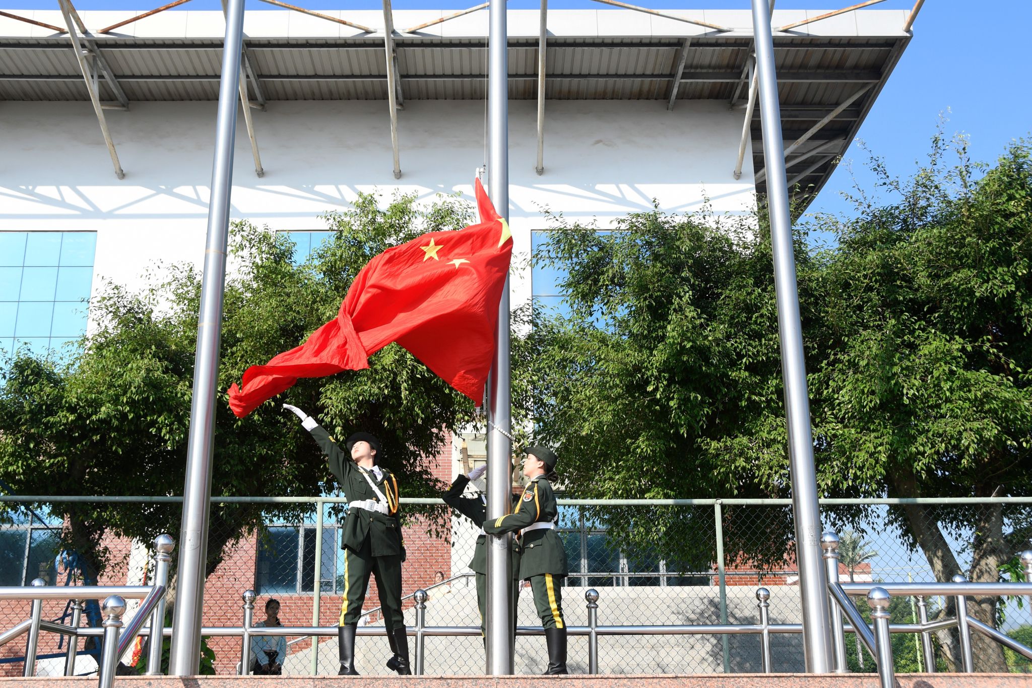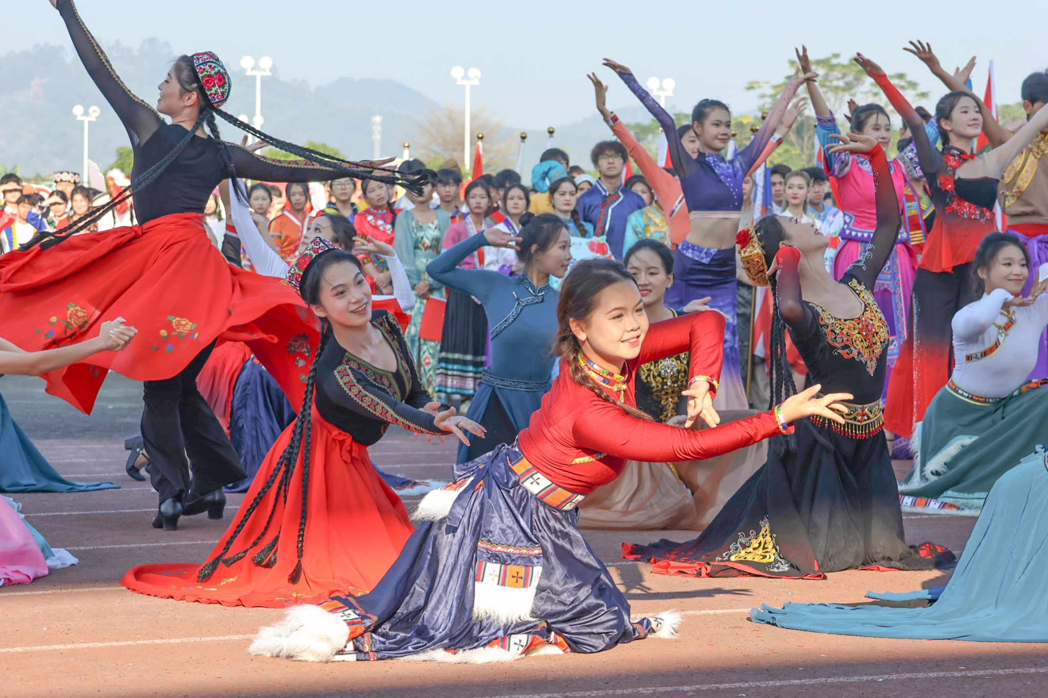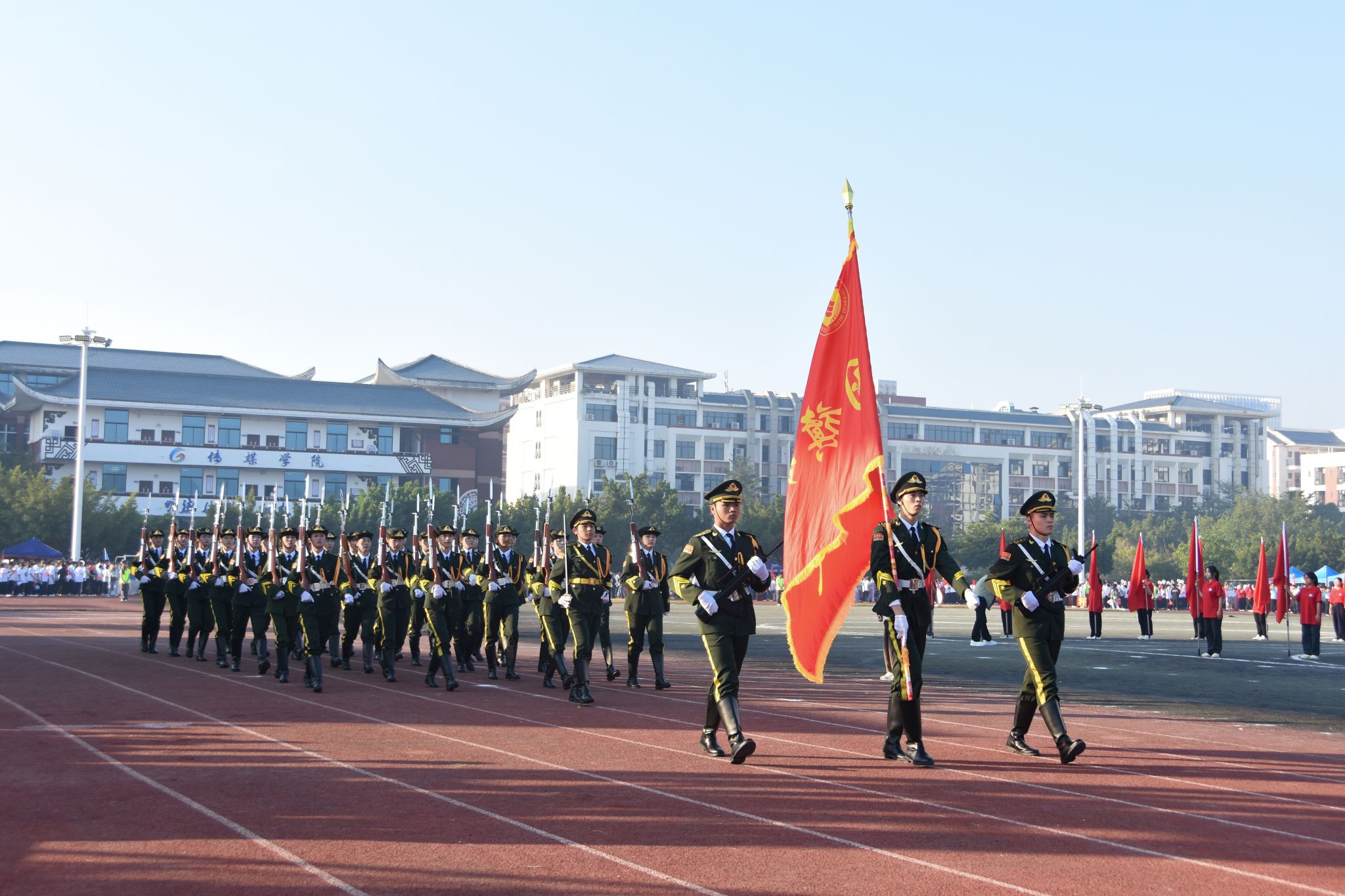 伴随着激昂的《运动员进行曲》,国旗方队、校旗方队、礼宾枪方块队、裁判员代表队、不同民族同学组成的红石榴方块队、各学院代表队意气风发依次入场,嘹亮的口号、精彩的表演传递出民大师生的青春风采,花样篮球、跳绳方队的花式表演为入场式更添活力。