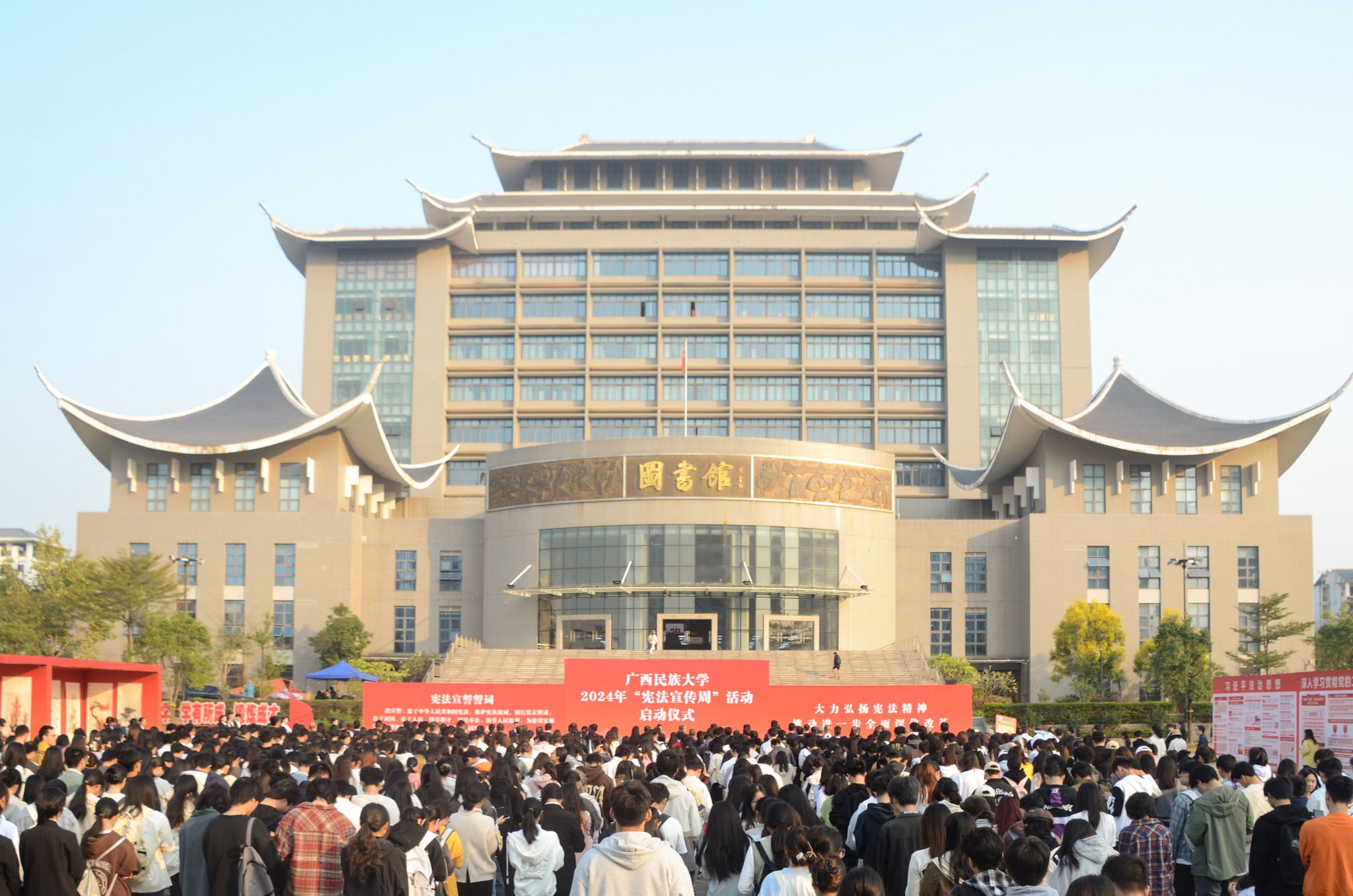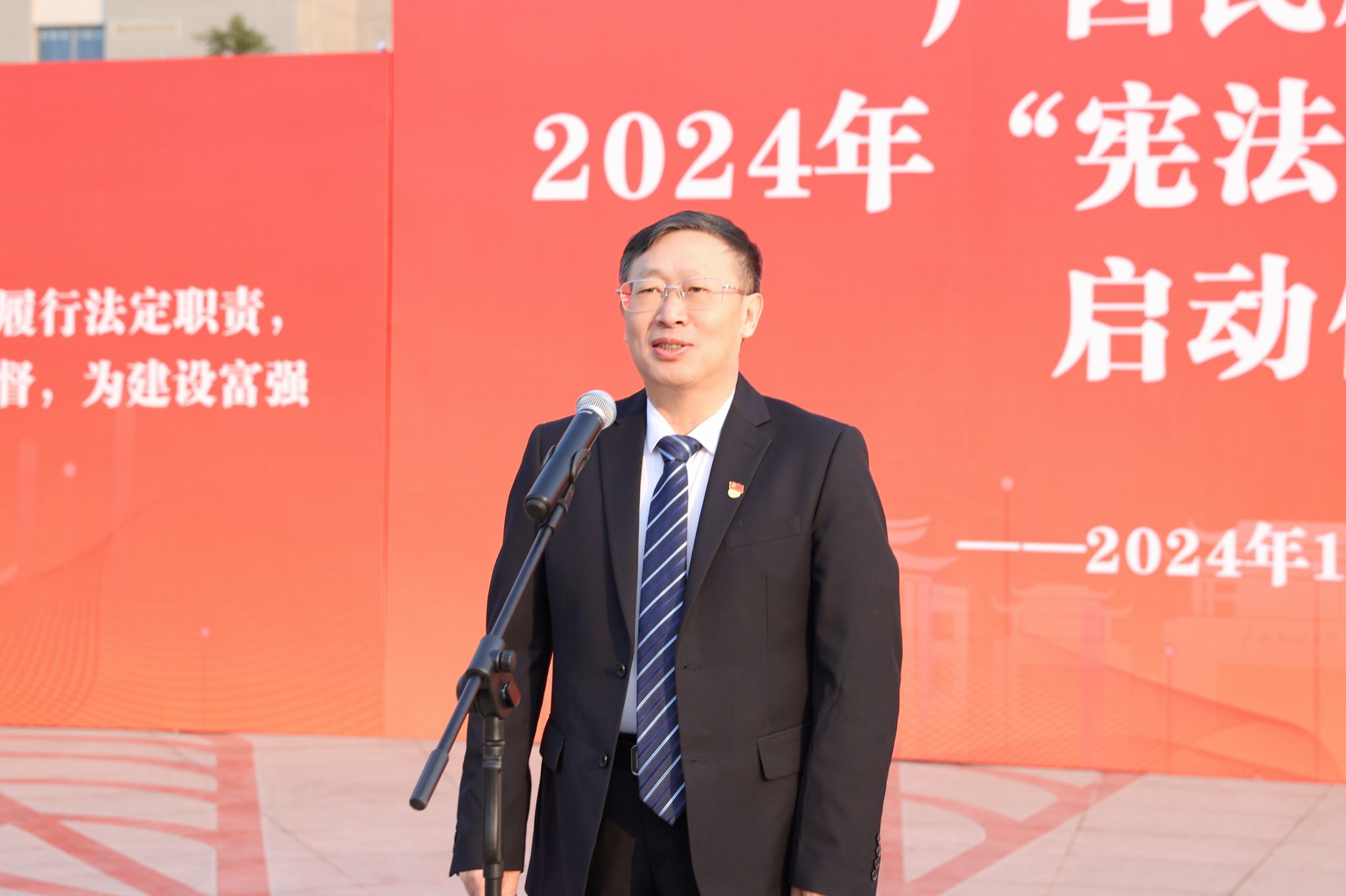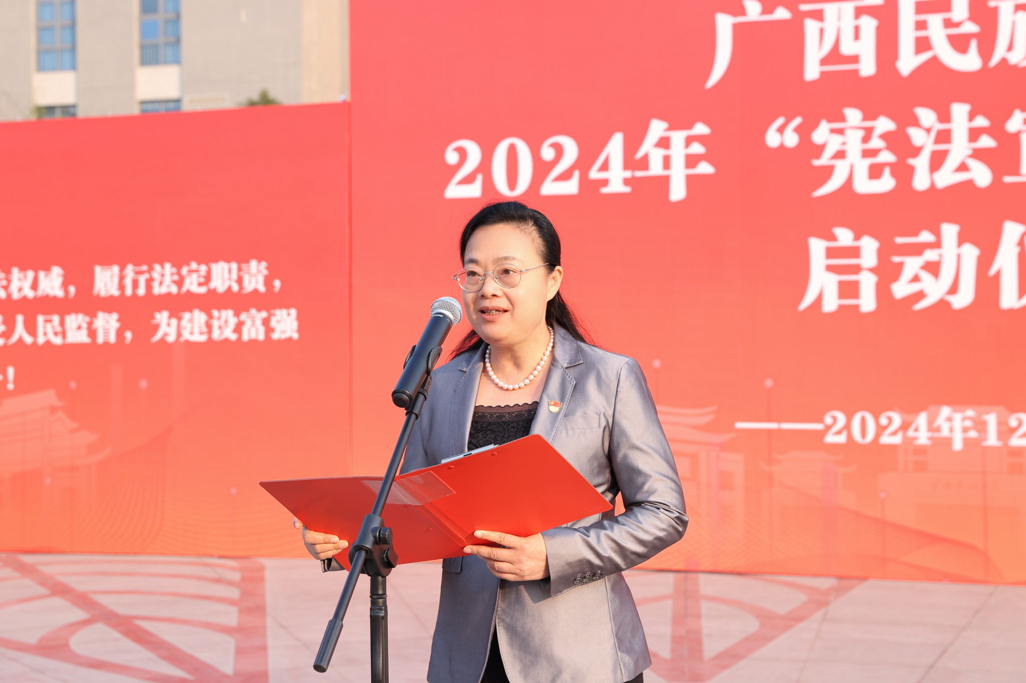 【大学生通讯社报道】12月4日上午,beat365亚洲体育官方网站2024年“宪法宣传周”活动启动仪式在思源湖校区民族广场举行。学校党委书记卞成林出席仪式并宣布活动正式启动。校长韦仕珍出席并致辞。全体在家校领导、学校中层领导干部、法学院全体教师以及其他学院师生代表参加活动。学校党委副书记邓国彬主持仪式并领誓。