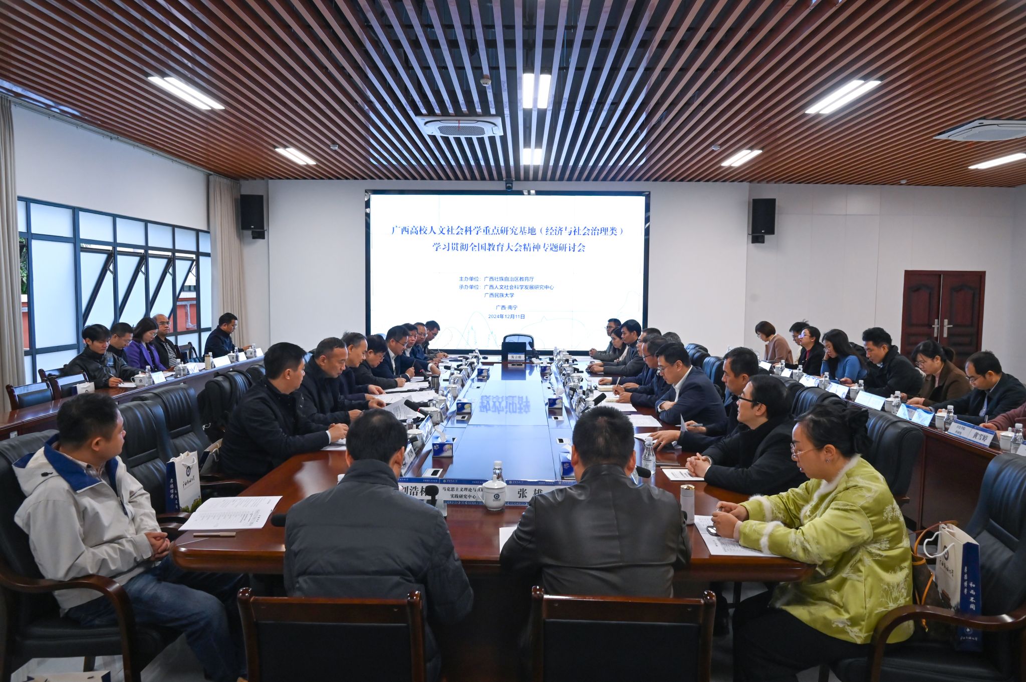 会上,参会人员集中学习了习近平总书记在全国教育大会上的重要讲话精神,重点就将深入学习贯彻全国教育大会精神与深入贯彻落实习近平总书记关于广西工作论述的重要要求相结合,有效提升广西高校人文社会科学重点研究基地科研水平,提升服务地方党委政府决策和推动地方经济社会发展的能力进行了研讨。
