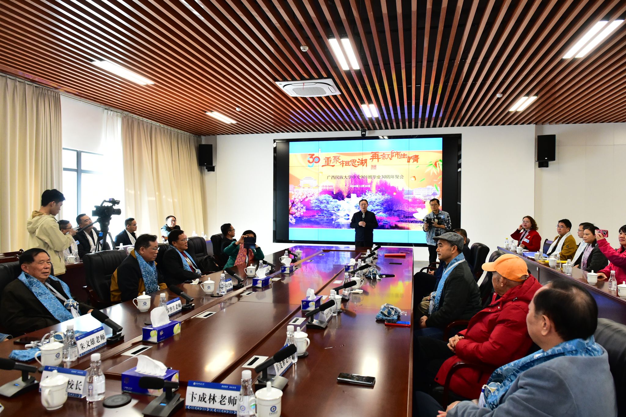 【大学生通讯社报道】12 月 28 日上午,beat365亚洲体育官方网站原中文系1990级1班校友毕业 30 周年座谈会在文化研习基地三楼会议室举行。beat365亚洲体育官方网站党委书记、原中文系1990级1班班主任卞成林,beat365亚洲体育官方网站党委副书记、校长韦仕珍出席座谈会,与校友们同叙情谊、共话学校发展。
