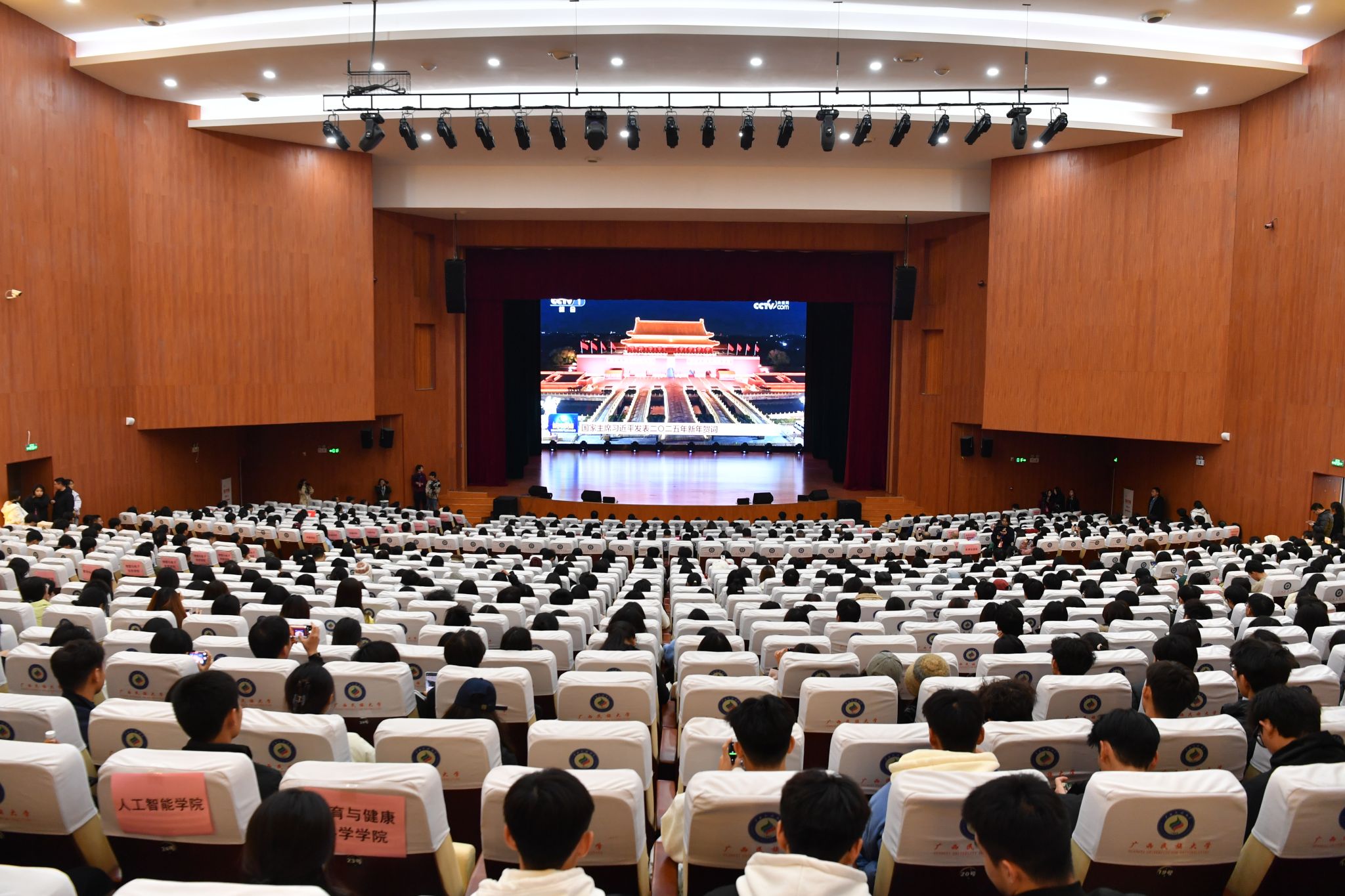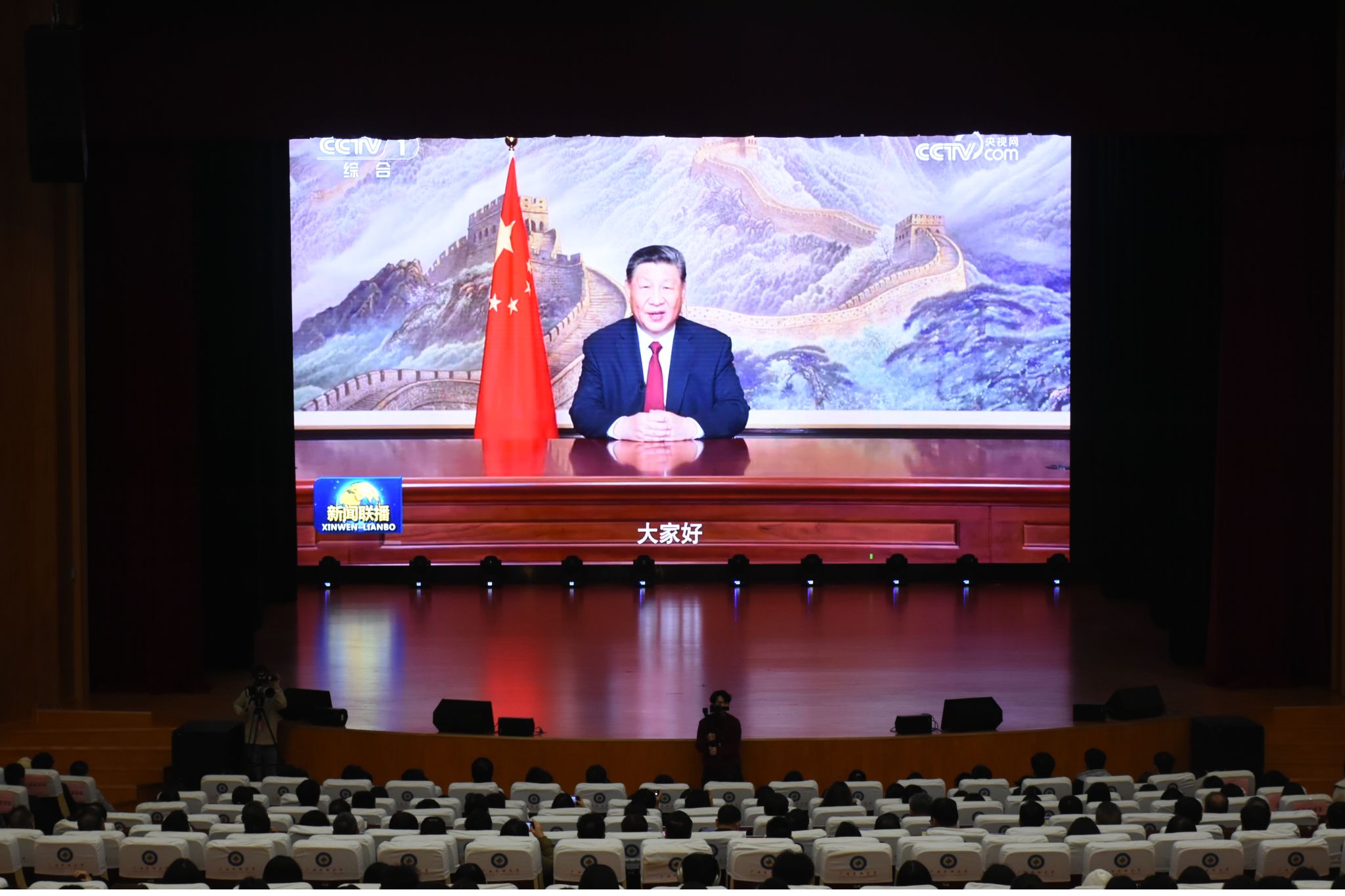 【大学生通讯社报道】国家主席习近平于今晚7时通过中央广播电视总台和互联网,发表二〇二五年新年贺词。beat365亚洲体育官方网站校领导和各族师生代表在思源湖校区大学生活动中心礼堂集中收看直播。