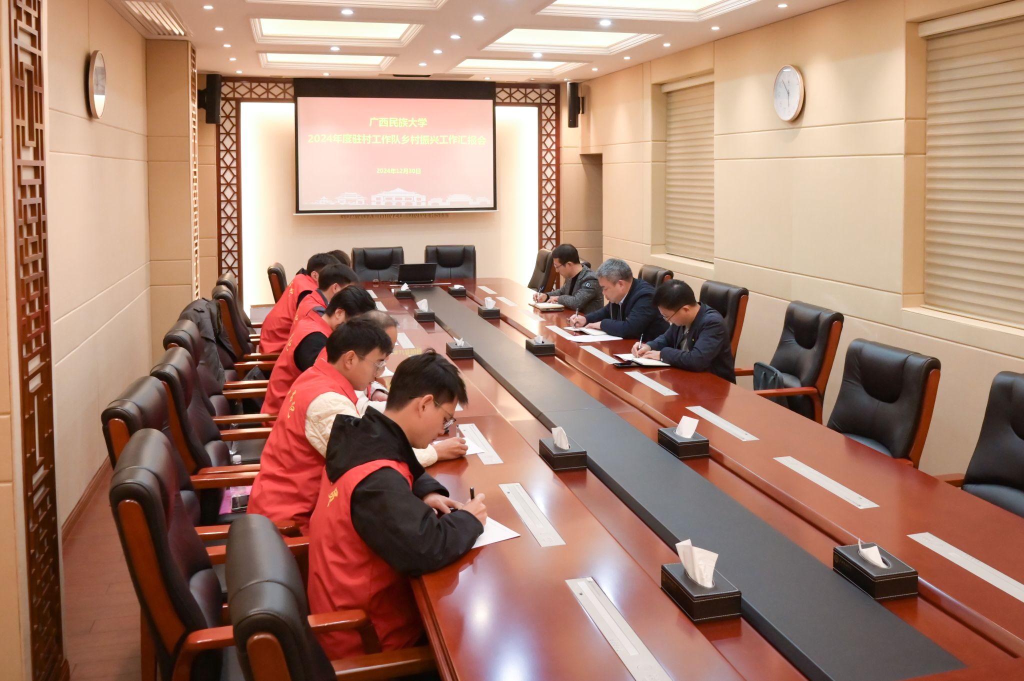 12月30日,学校党委副书记陈铭彬主持召开2024年度驻村工作队乡村振兴工作汇报会,强调驻村工作队要加强与村“两委”的沟通协调,强化村民自治组织培育,完善乡村治理体系现代化建设,推动产业升级强基固本,加大本地特色产业培育力度,深挖文化内涵,创新文化活动形式,提升治理效益,实现社会经济效益双丰收。