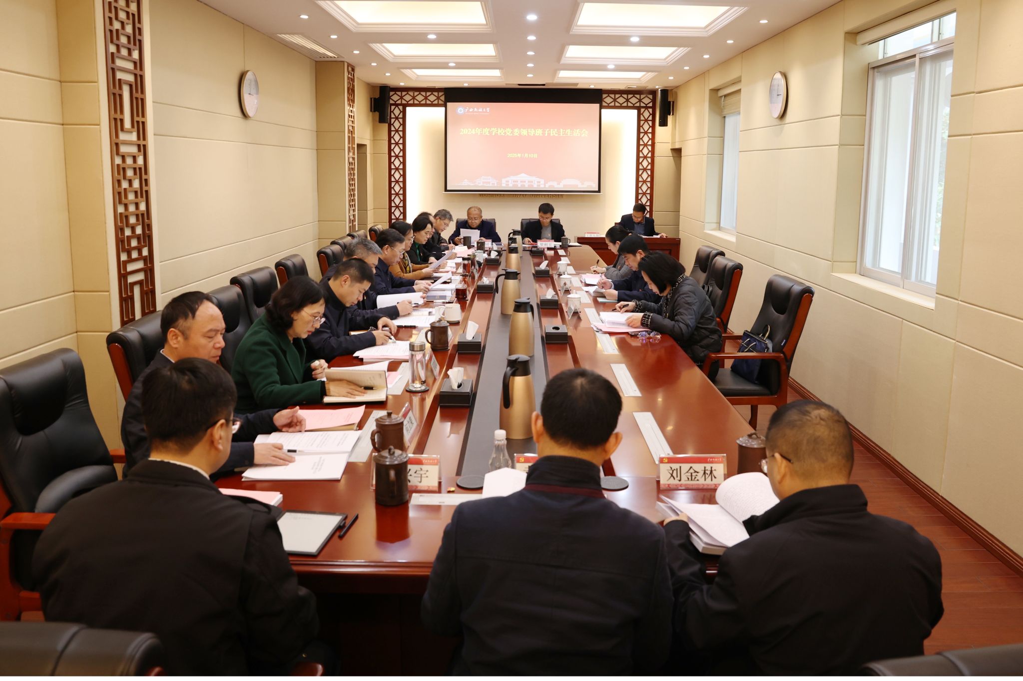 根据自治区党委的部署要求,1月10日下午,beat365亚洲体育官方网站党委领导班子召开2024年度民主生活会。会议紧扣“深入学习贯彻习近平新时代中国特色社会主义思想,巩固深化党纪学习教育成果,综合发挥党的纪律教育约束、保障激励作用,为进一步全面深化改革、推进中国式现代化提供坚强纪律保证”主题,精心组织学习研讨,深入剖析典型案例,联系思想和工作实际,开展对照检查,进行党性分析,严肃开展批评与自我批评。学校党委书记卞成林主持会议并讲话。自治区党委教育工委专职副书记、教育厅党组成员李晓勇,自治区党委教育工委组织部部长唐春燕,自治区纪委监委第九监督检查室副主任赵庆华到会指导。