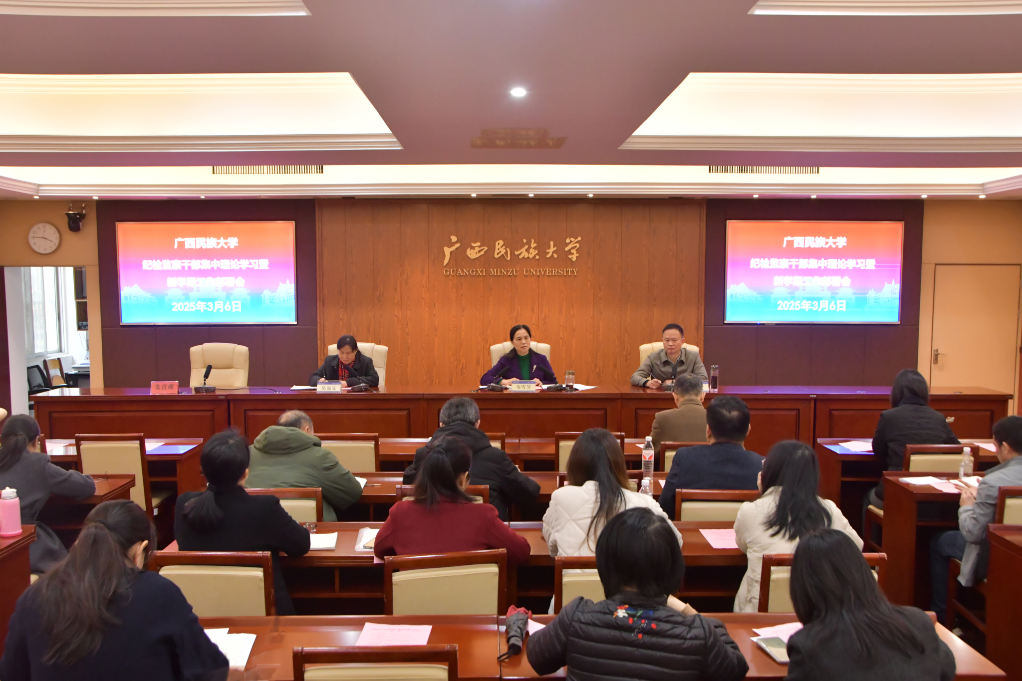 3月6日,自治区纪委监委驻校纪检监察组组长,学校党委副书记、纪委书记韦雪芳主持召开纪检监察干部集中理论学习暨新学期工作部署会,要求切实维护学校政治、意识形态和校园环境安全,聚焦教育教学改革发展中心任务,扛起监督责任,加强纪检监察工作规范化法治化正规化建设,巩固党纪学习教育、纪检监察干部队伍教育整顿成果。(初审/李济权 复审/荣子卿 终审/孙寿媚)
