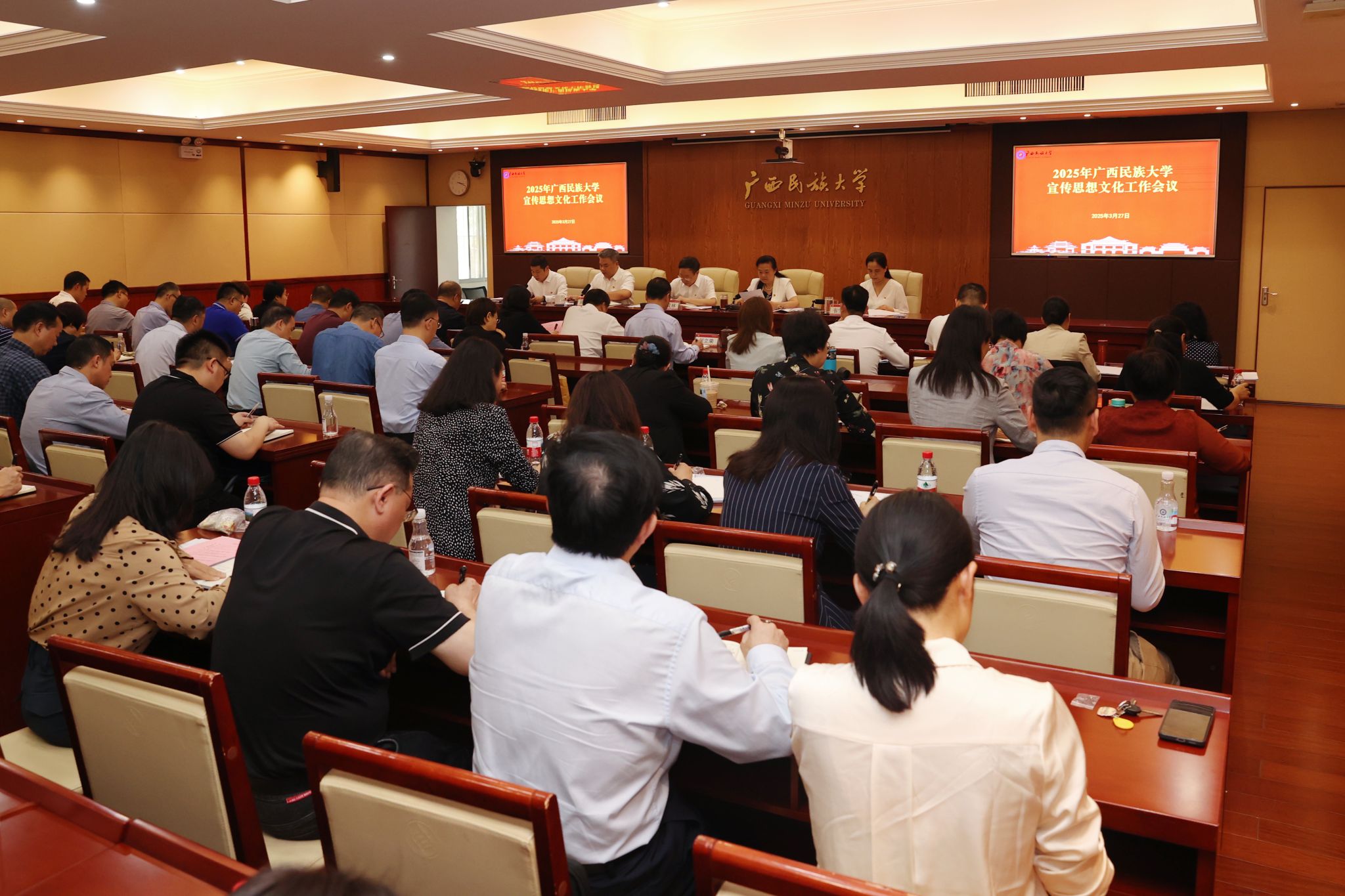 3月27日,beat365亚洲体育官方网站召开2025年宣传思想文化工作会议,校党委书记卞成林出席会议并讲话,党委副书记、校长韦仕珍主持会议,校领导陈铭彬、韦雪芳、邓国彬、蔡高根、黄晓娟、何立荣、姜明国出席会议。校党委副书记邓国彬作2025年宣传思想文化工作报告。