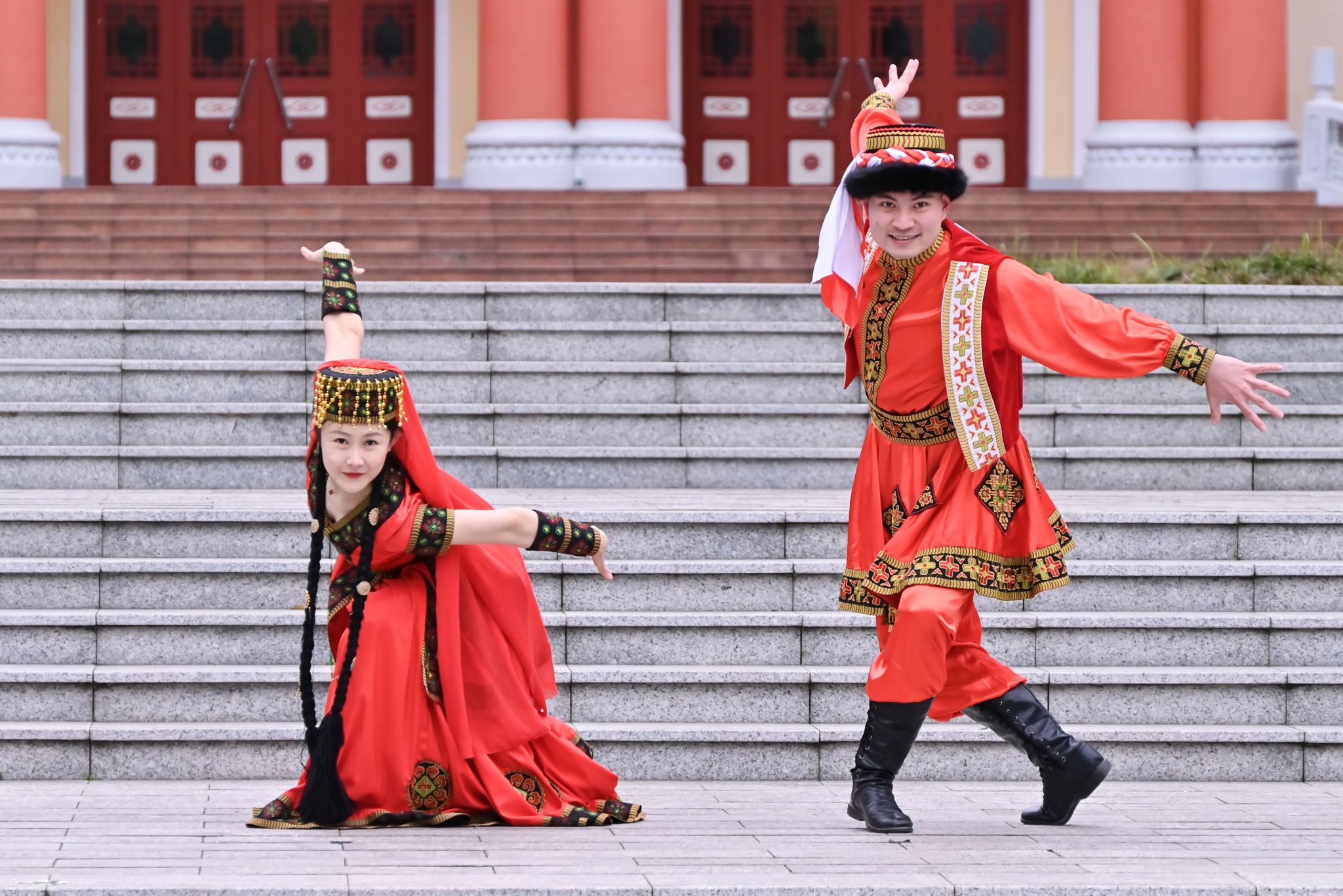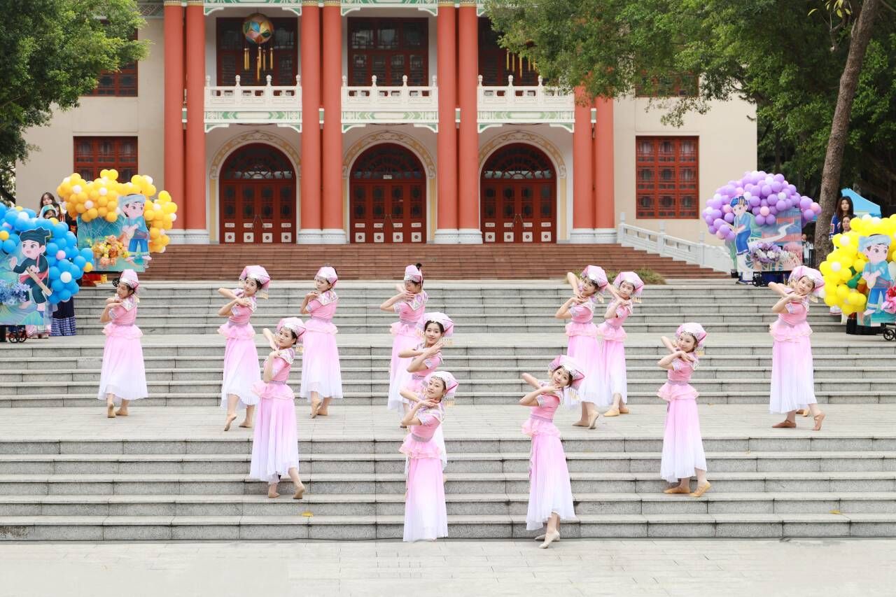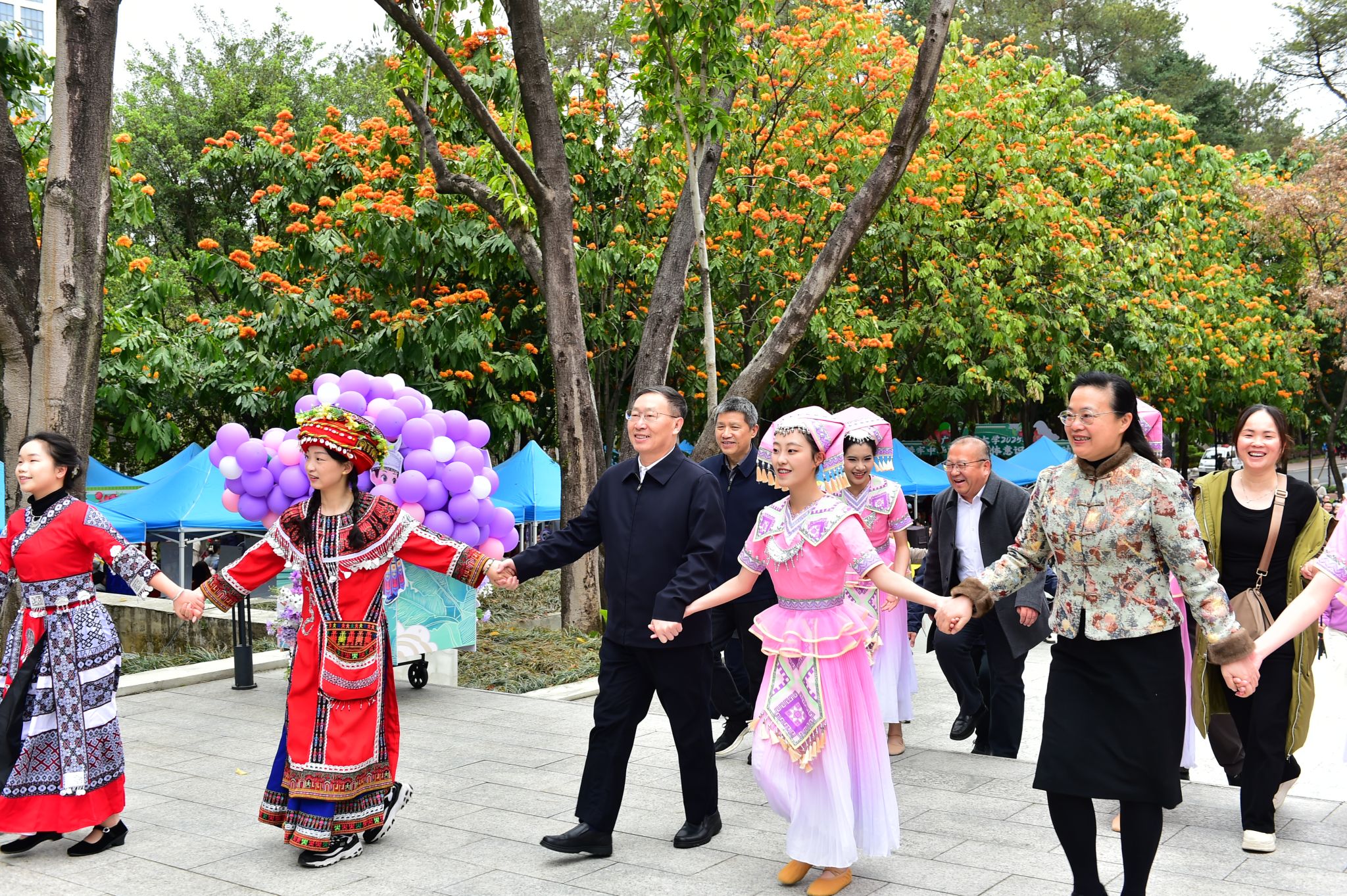 《爱我中华》的歌声响起,台下嘉宾和师生移步至广场中央,手拉着手共跳《圆圈舞》,现场气氛欢快热烈,呈现出中华民族一家亲的和谐美好。