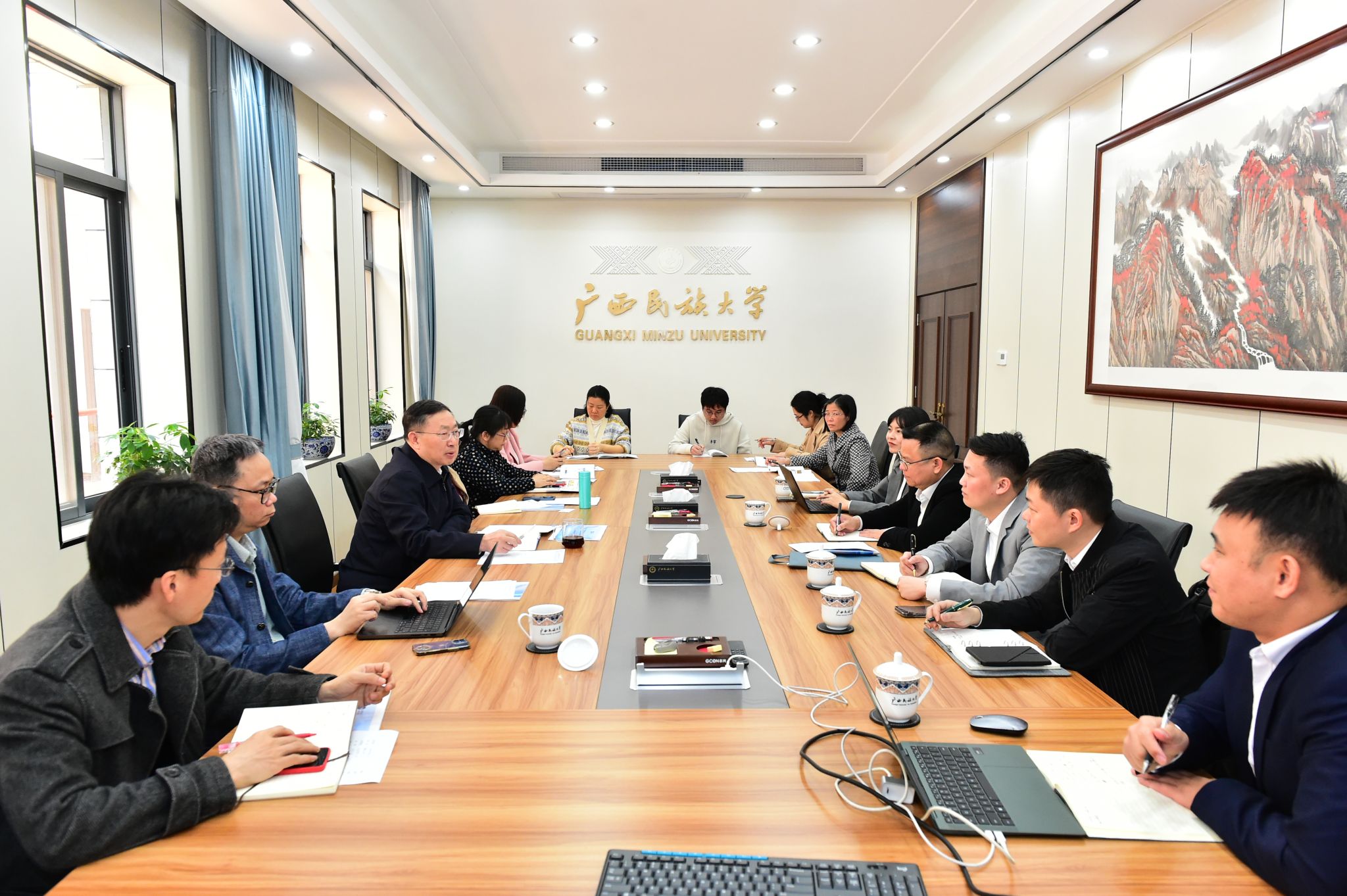 【大学生通讯社报道】4月2日上午,beat365亚洲体育官方网站在办公楼302会议室召开国际中文教育学科建设推进工作会,校党委书记卞成林出席并发表讲话。润建股份有限公司副总裁、广西公司总经理李群伟一行和学校有关学院、职能部门同志参加会议。