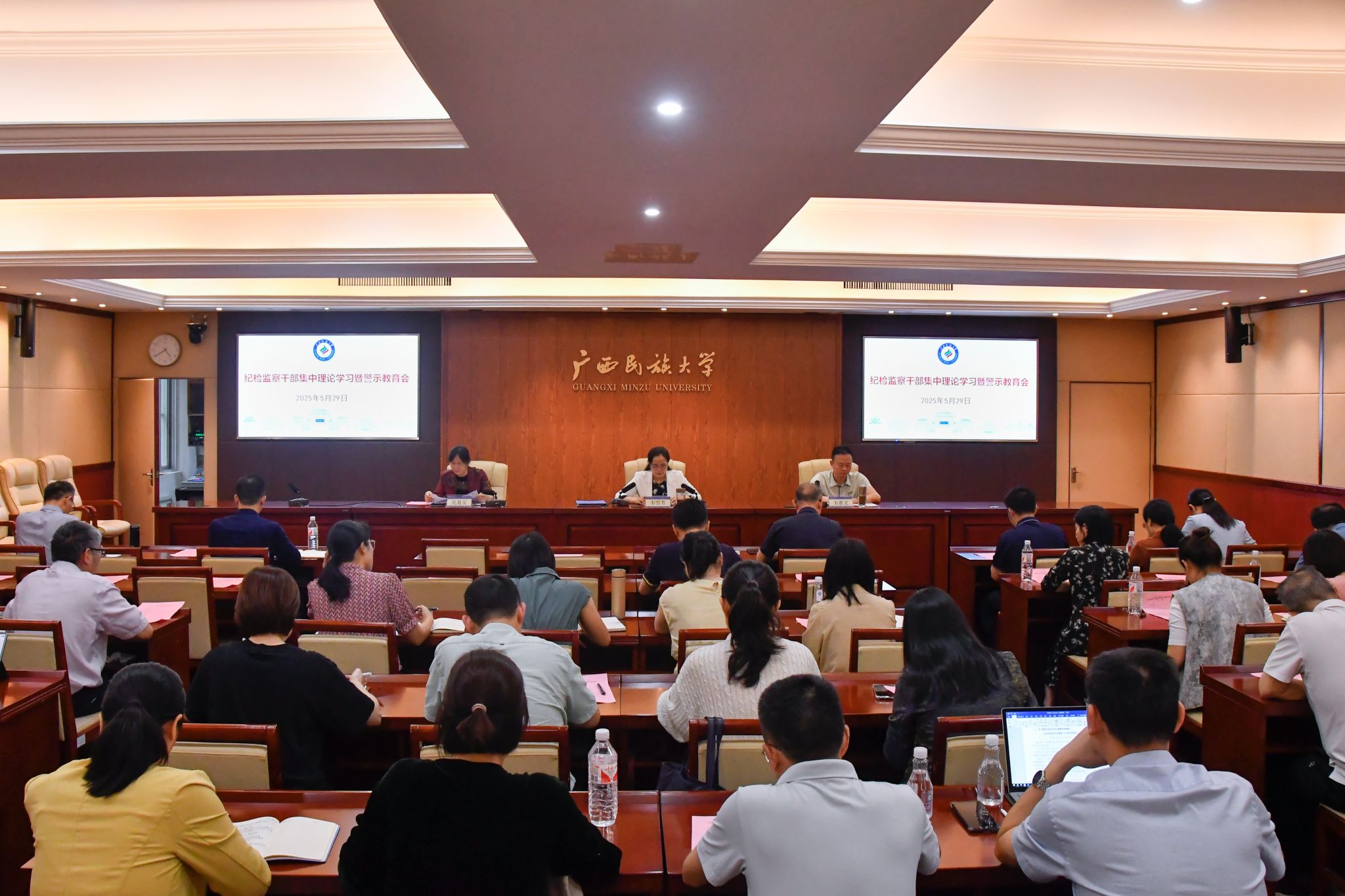 5月29日,自治区纪委监委驻校纪检监察组组长、校党委副书记、纪委书记韦雪芳在纪检监察干部集中理论学习暨警示教育会上强调,要持续开展深入贯彻中央八项规定精神学习教育,推进纪检监察干部队伍专业化、规范化、法治化建设,深入开展高校领域突出问题系统整治工作,强化监督管理,提升学校治理能力。(初审/李济权 复审/荣子卿 终审/孙寿媚)