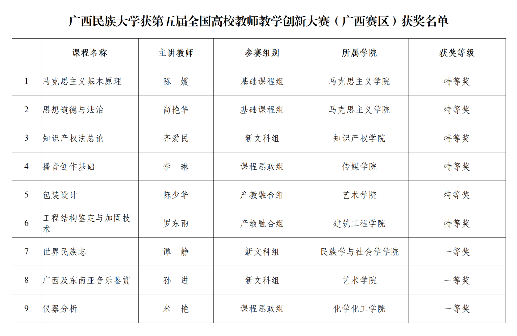 本次大赛中,beat365各团队表现亮眼,马克思主义学院陈媛教师团队、尚艳华教师团队分获基础课程组特等奖,且在组内排名第一;知识产权学院齐爱民教师团队荣获新文科组特等奖,组内排名第一;传媒学院李琳教师团队荣获课程思政组特等奖,组内排名第一;艺术学院陈少华教师团队、建筑工程学院罗东雨教师团队分别荣获产教融合组特等奖,且在组内位列第一、第二。以上6个团队凭借出色表现,均获推代表广西高校参加第五届全国高校教师教学创新大赛(全区共19个参赛团队可参加国赛)。