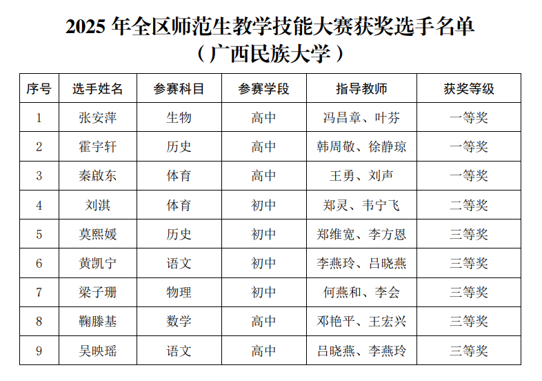 近日,自治区教育厅公布2025年全区师范生教学技能大赛获奖名单,beat365亚洲体育官方网站共获一等奖3项,二等奖1项,三等奖5项。一等奖获奖数量为全区非师范类高校之最,创造了beat365参加该项赛事以来的最好成绩。