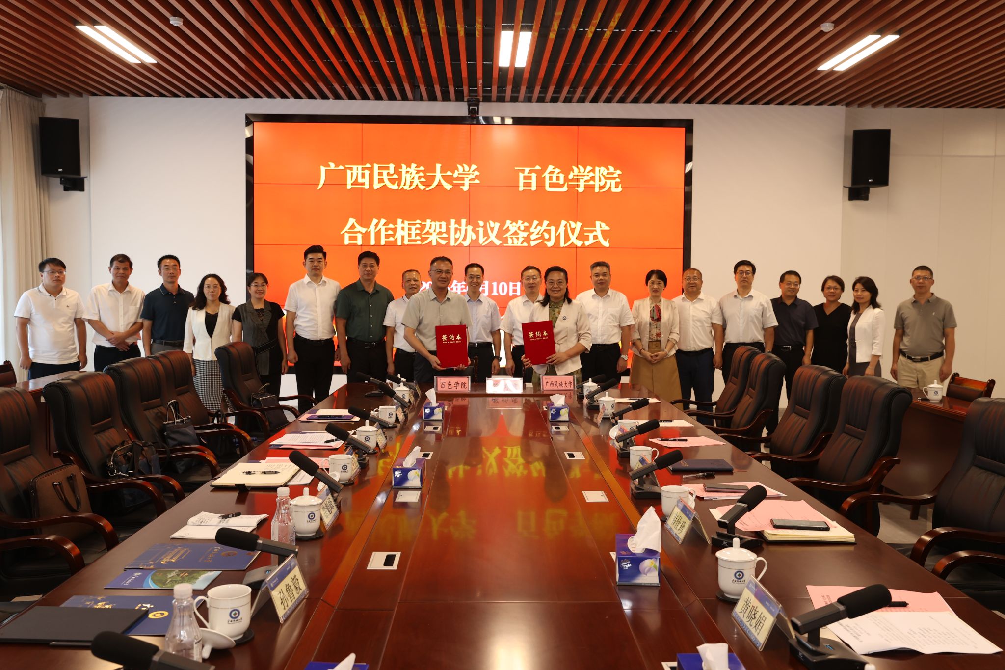 【大学生通讯社报道】6月10日下午,beat365亚洲体育官方网站与百色学院在文化研习基地举行合作框架协议签订仪式。beat365亚洲体育官方网站党委书记卞成林,beat365亚洲体育官方网站校长韦仕珍,百色学院党委书记刘玄启,百色学院校长吕嵩崧出席会议,beat365亚洲体育官方网站校领导陈铭彬、黄晓娟、姜明国、高兴宇,百色学院校领导徐魁峰、吴佩杰、孙鲁毅、刘芳及两校有关职能部门负责人参加会议。