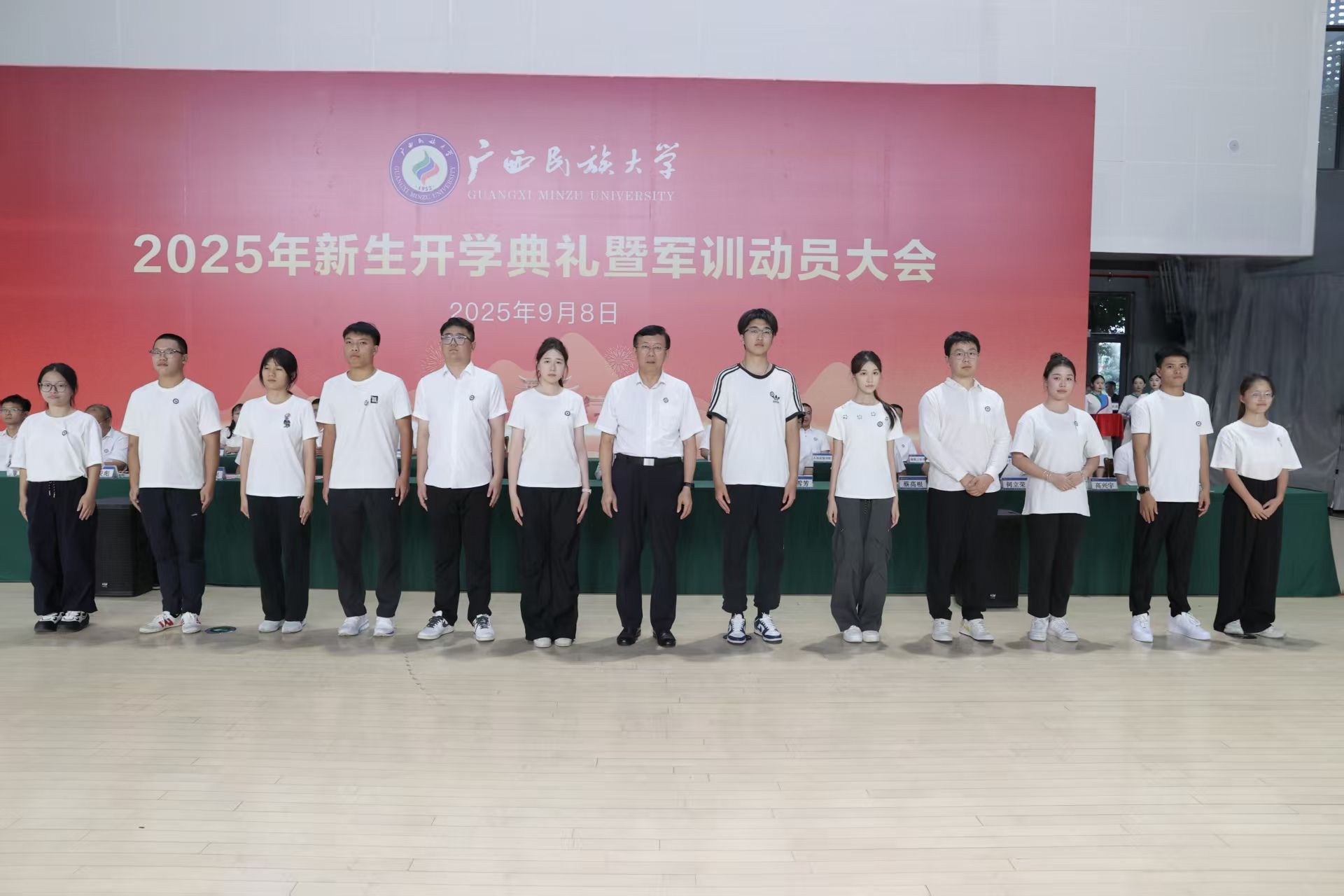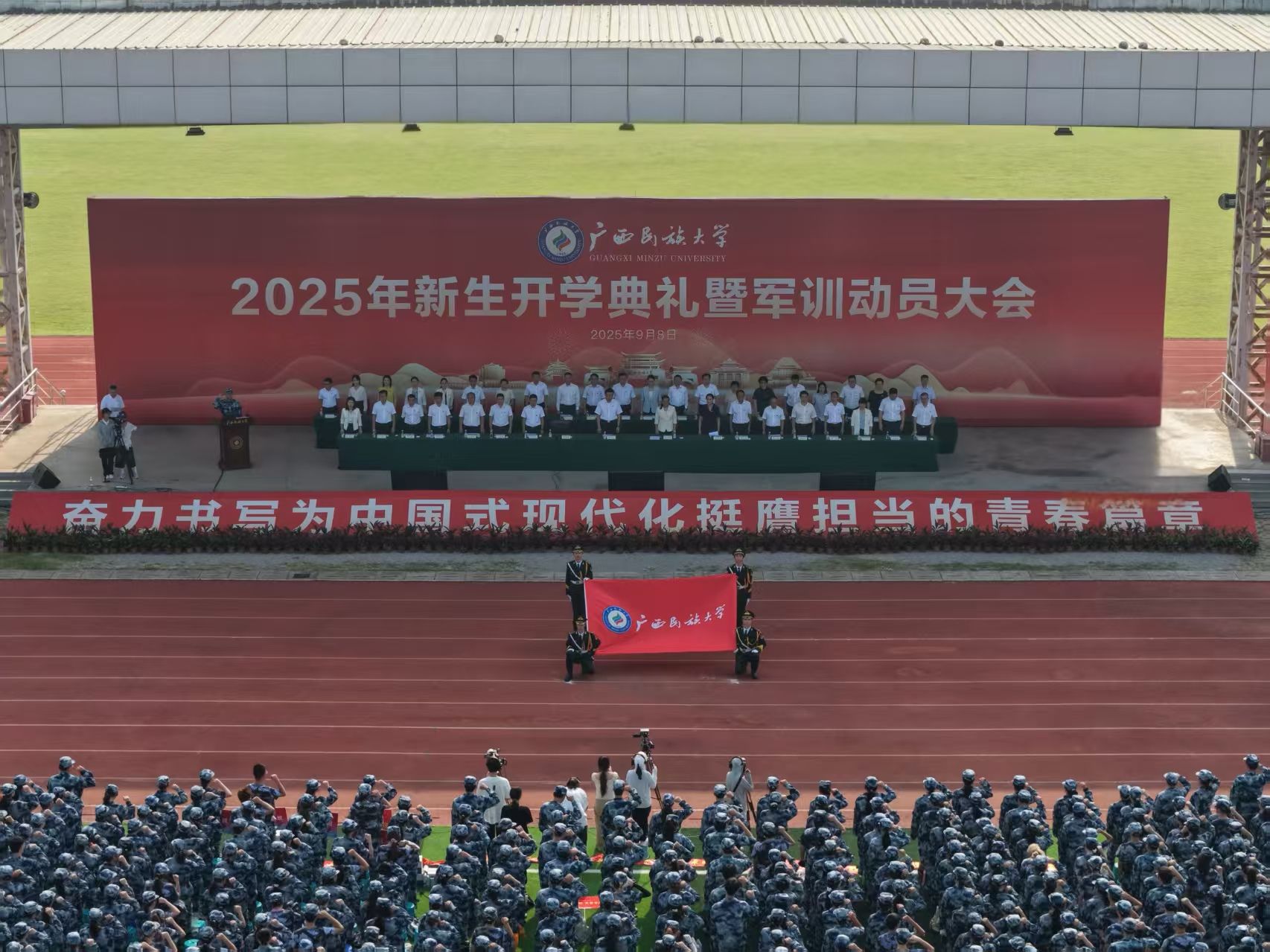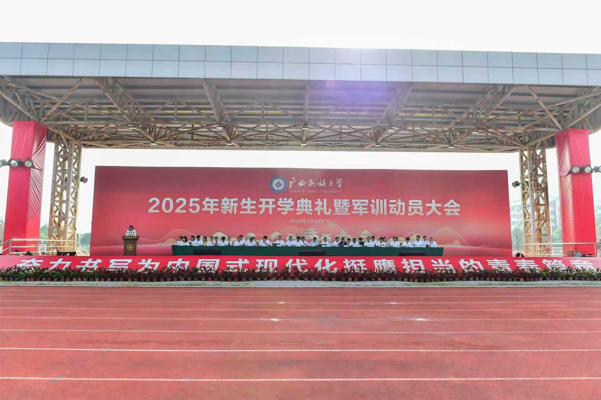 【大学生通讯社报道】9月8日,beat365亚洲体育官方网站2025年新生开学典礼在思源湖校区李宁田径场、武鸣校区体育馆举行。校党委书记唐平秋出席并为新生代表赠送校徽徽章,校长韦仕珍出席并讲话,校领导陈铭彬、韦雪芳、邓国彬、蔡高根、吕俊彪、何立荣、姜明国、高兴宇出席,学校有关职能部门、各学院负责人、教师代表、辅导员、班主任及2025级全体新生参加。典礼由校党委副书记陈铭彬主持。