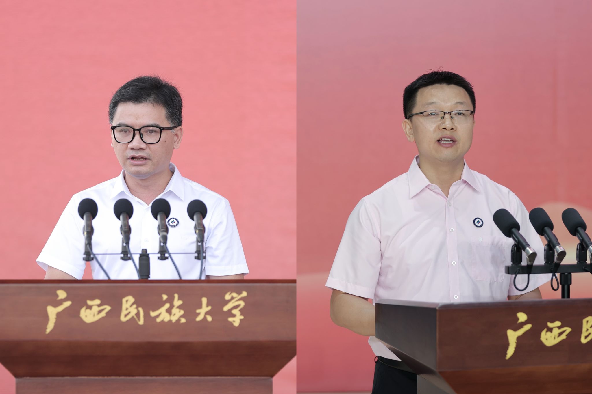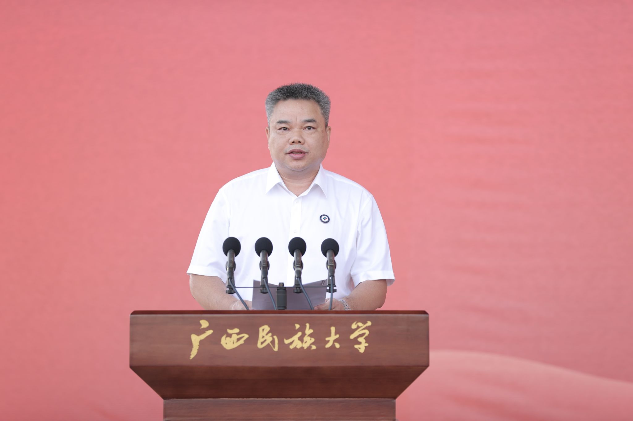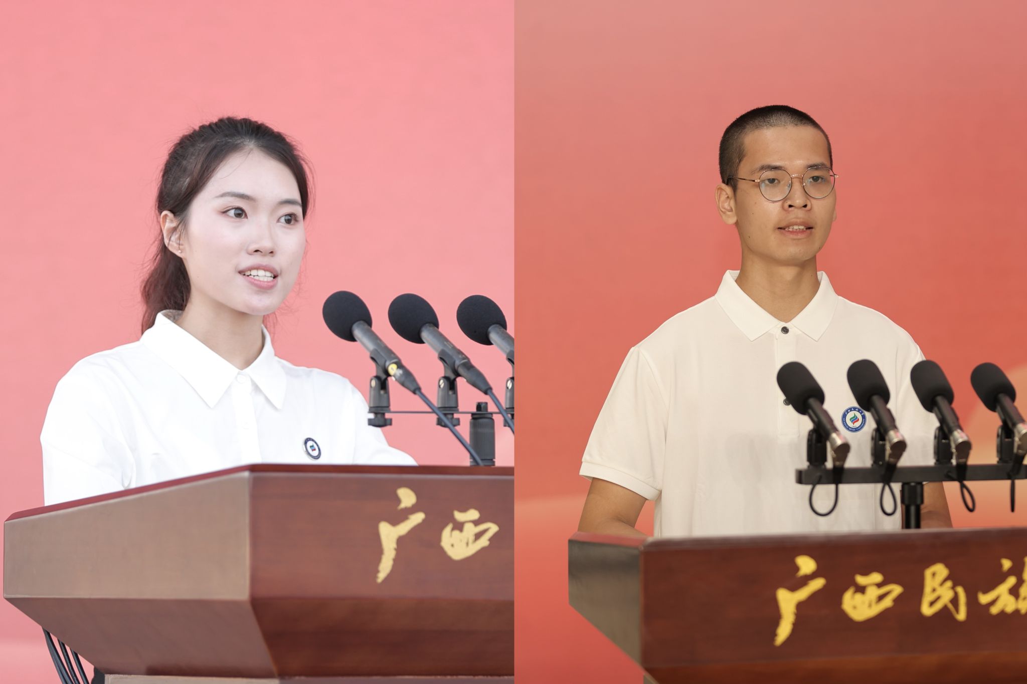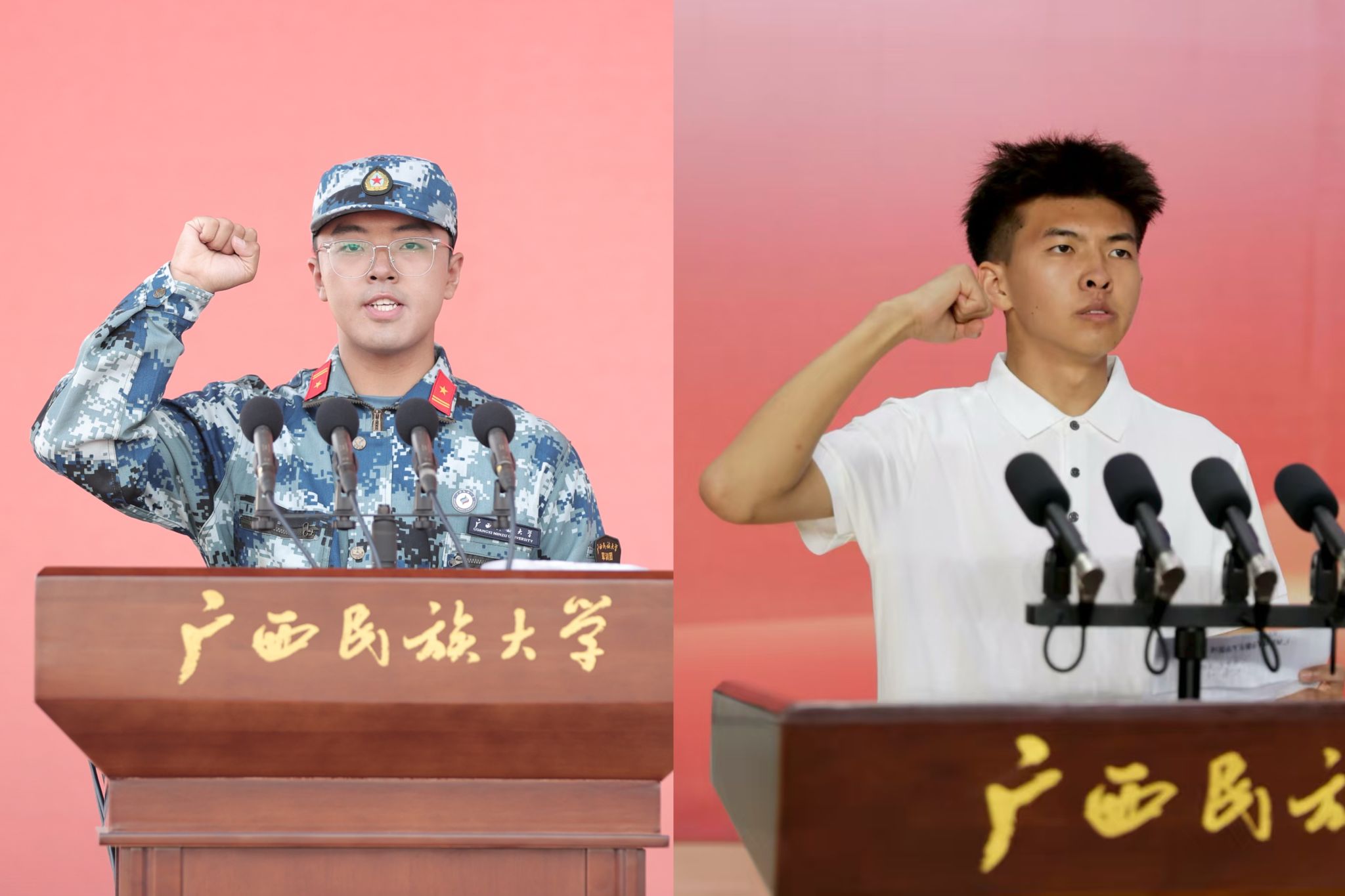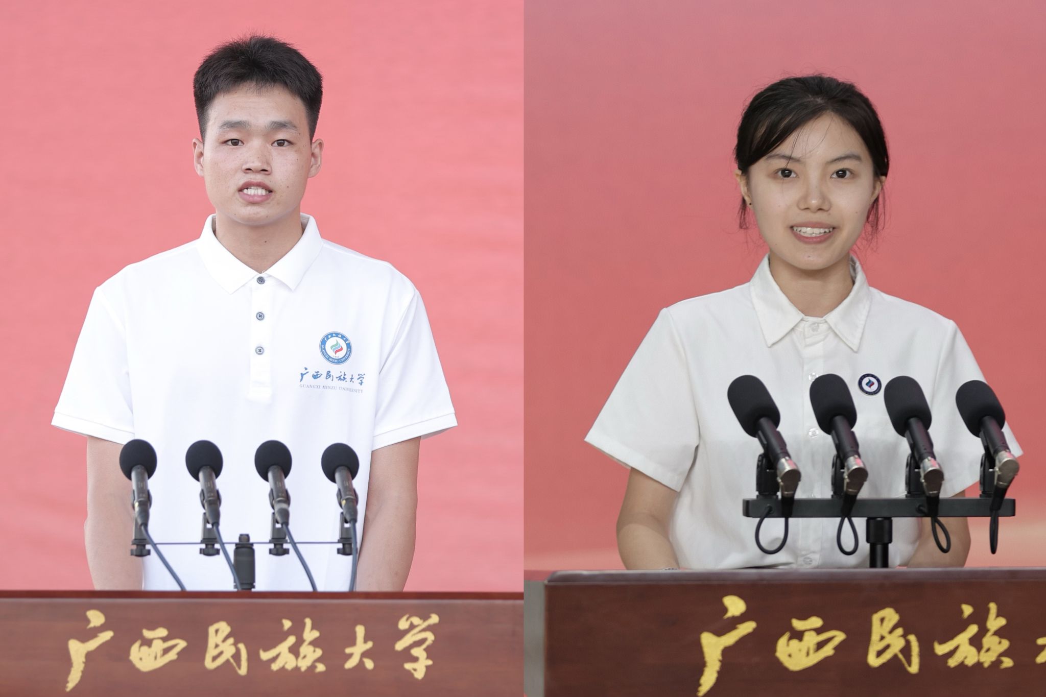 典礼上,新生们佩戴民大校徽徽章,郑重宣誓:“我是一名光荣的广西民大人,铭记‘厚德博学,和而不同’的校训,牢记领袖嘱托,勇担时代重任……为民族团结进步和中华民族伟大复兴奋斗终身!”