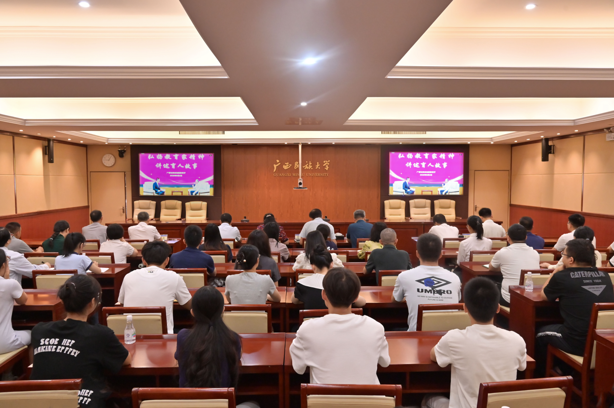 【大学生通讯社报道】9月5日上午,beat365亚洲体育官方网站在办公楼212会议室设立分会场,集中收看由自治区教育厅主办的“弘扬教育家精神,讲述育人故事”活动。校党委书记唐平秋,校长韦仕珍及全体在家校领导在分会场一同观看,副校长何立荣在自治区教育厅主会场参会。