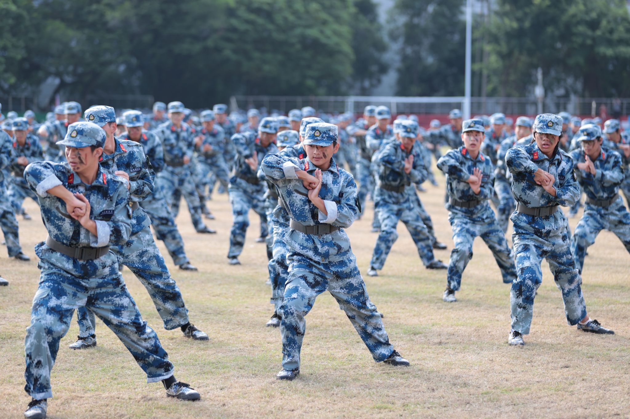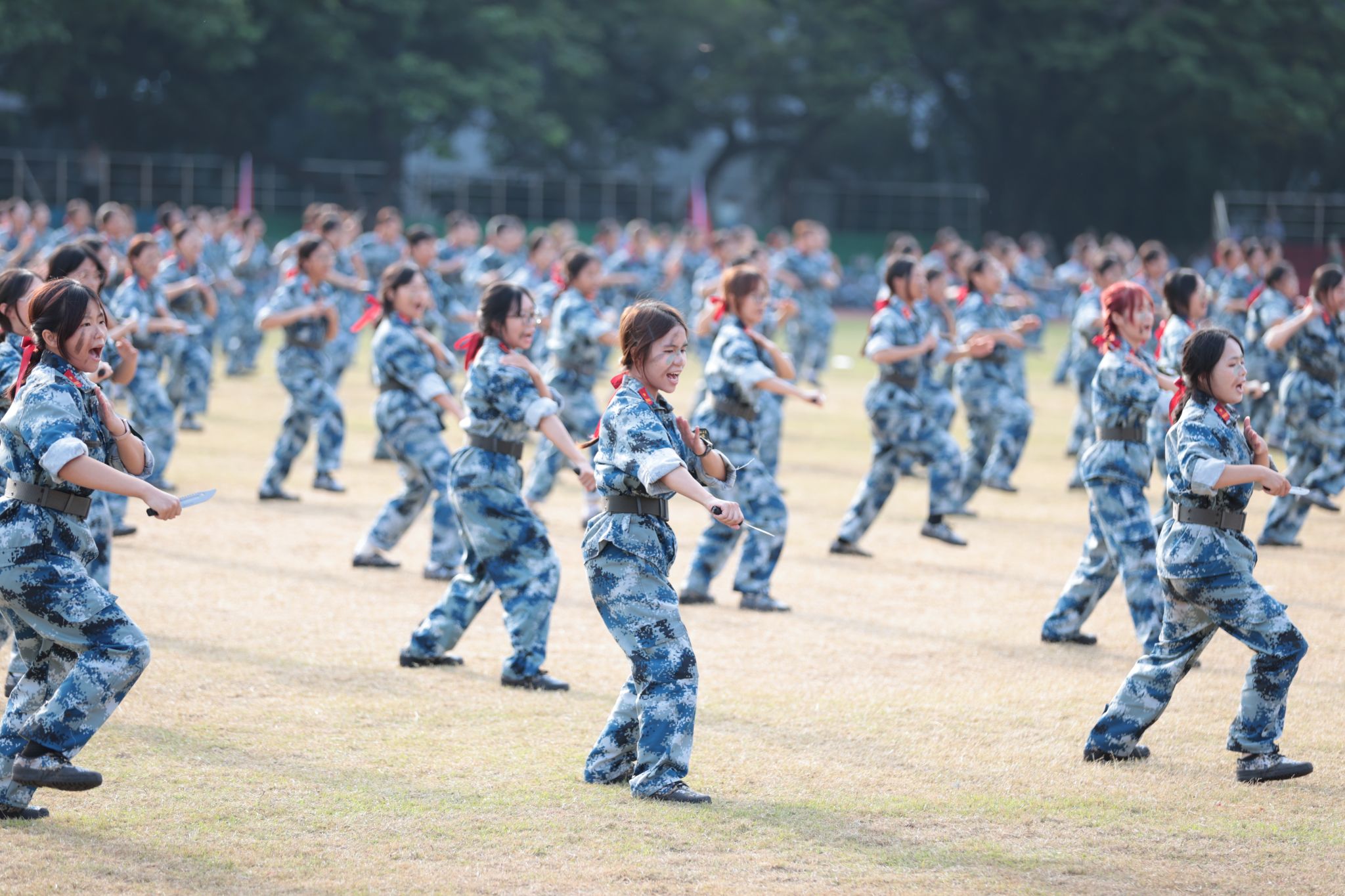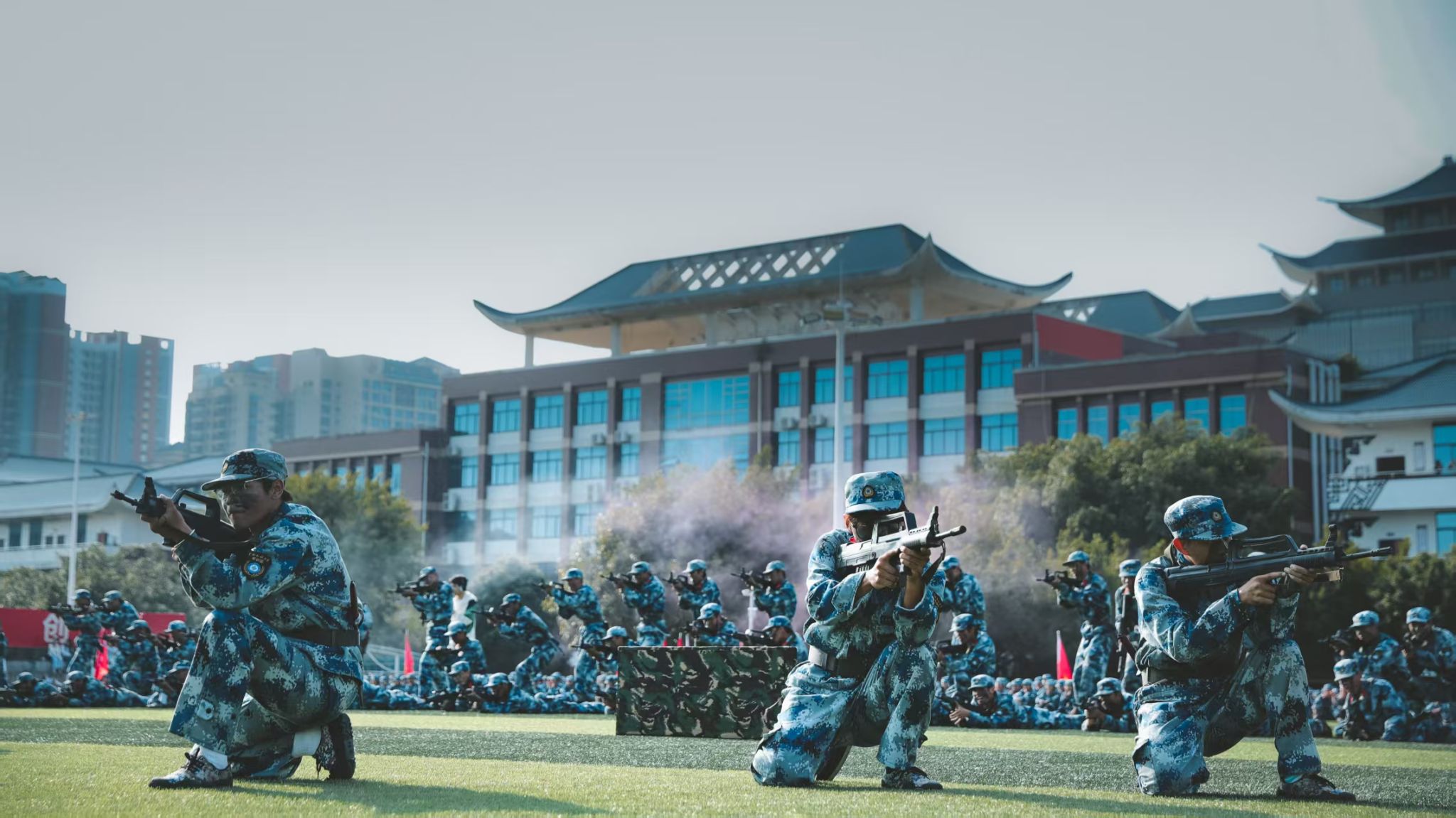 在各校区总指挥教官整队汇报后,参训新生依次进行分列式及军训科目展示。分列式方阵军姿挺拔、步伐铿锵,有序通过主席台;匕首操方阵动作干净利落,抽鞘、弓步、上刺、侧刺等连贯招式一气呵成,势如破竹;倒功方阵跃起前扑、侧倒后倒,一攻一防,展现钢铁意志;大刀方阵紧握军刀,劈砍格挡间尽显刚劲;拳术方阵拳拳到位,“呼哈”声中擒敌拳招招凌厉;应急棍术方阵挥棍力道十足,左抡右戳、上挥下压间虎虎生风;模拟战术演练中,学生们全副武装,灵活运用战术动作,生动演绎情报处理、现场封锁与搜索、遭遇对峙等实战内容。