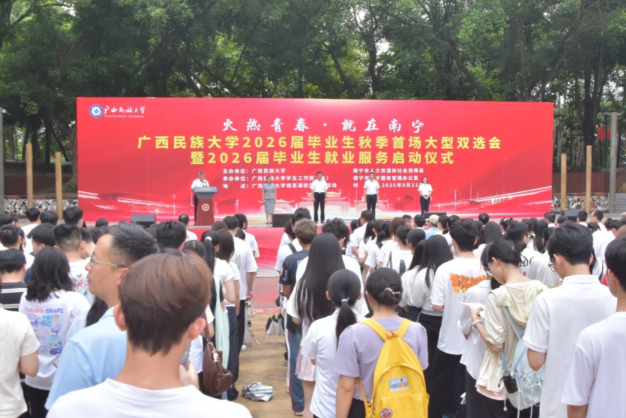 【大学生通讯社报道】9月21日上午,beat365亚洲体育官方网站举行2026届毕业生秋季首场大型双选会暨2026届毕业生就业服务启动仪式。校党委书记唐平秋出席仪式并讲话,校长韦仕珍出席活动,校党委副书记陈铭彬主持仪式。南宁市人力资源和社会保障局副局长陆多迎、各学院负责同志、教师及学生代表参加。