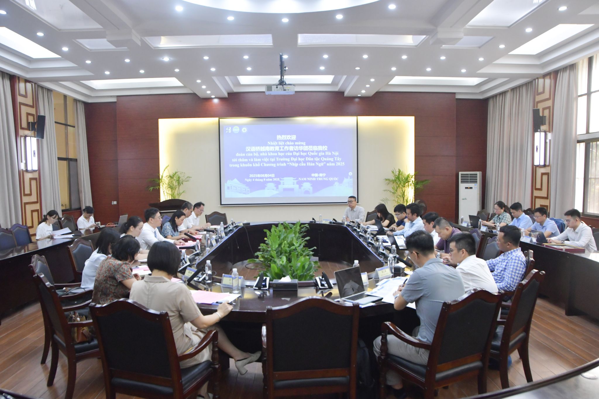 8月4日,学校党委常委、副校长高兴宇会见由越南河内国家大学科学与创新处副处长黎文朝等组成的汉语桥越南教育工作者访华团一行,双方希望在人工智能、电子信息、新能源材料等方面展开深入合作,共同推动两校发展。(初审/罗明 图文/马小丽 编/邓思馨 复审/韦利坤 终审/孙寿媚)