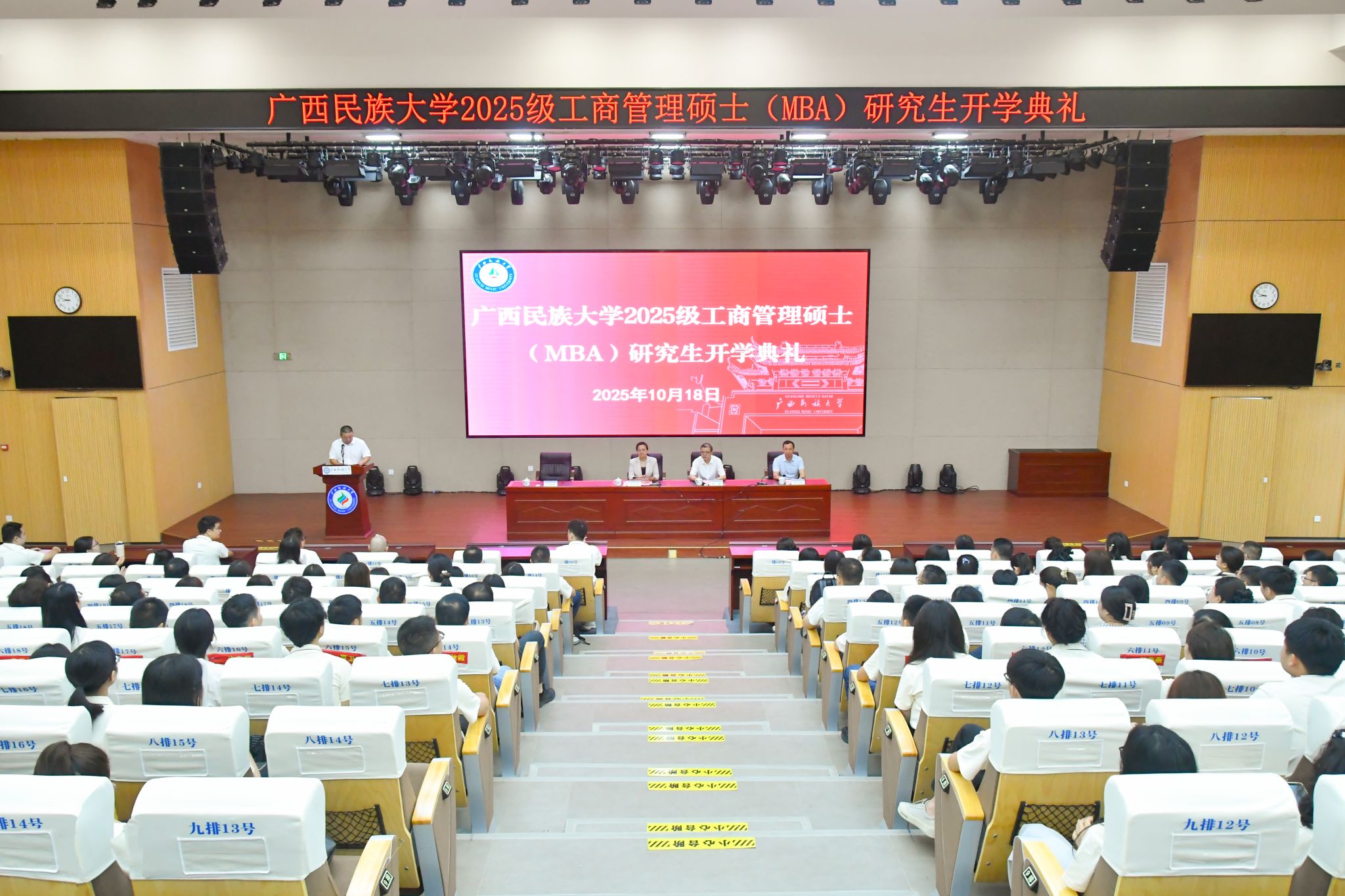 【大学生通讯社报道】10月18日,beat365亚洲体育官方网站2025级工商管理专业硕士(MBA)研究生开学典礼在相思湖校区文化研习基地举行。校长韦仕珍出席典礼,研究生工作部、研究生院负责人,2025级MBA新生参与典礼。
