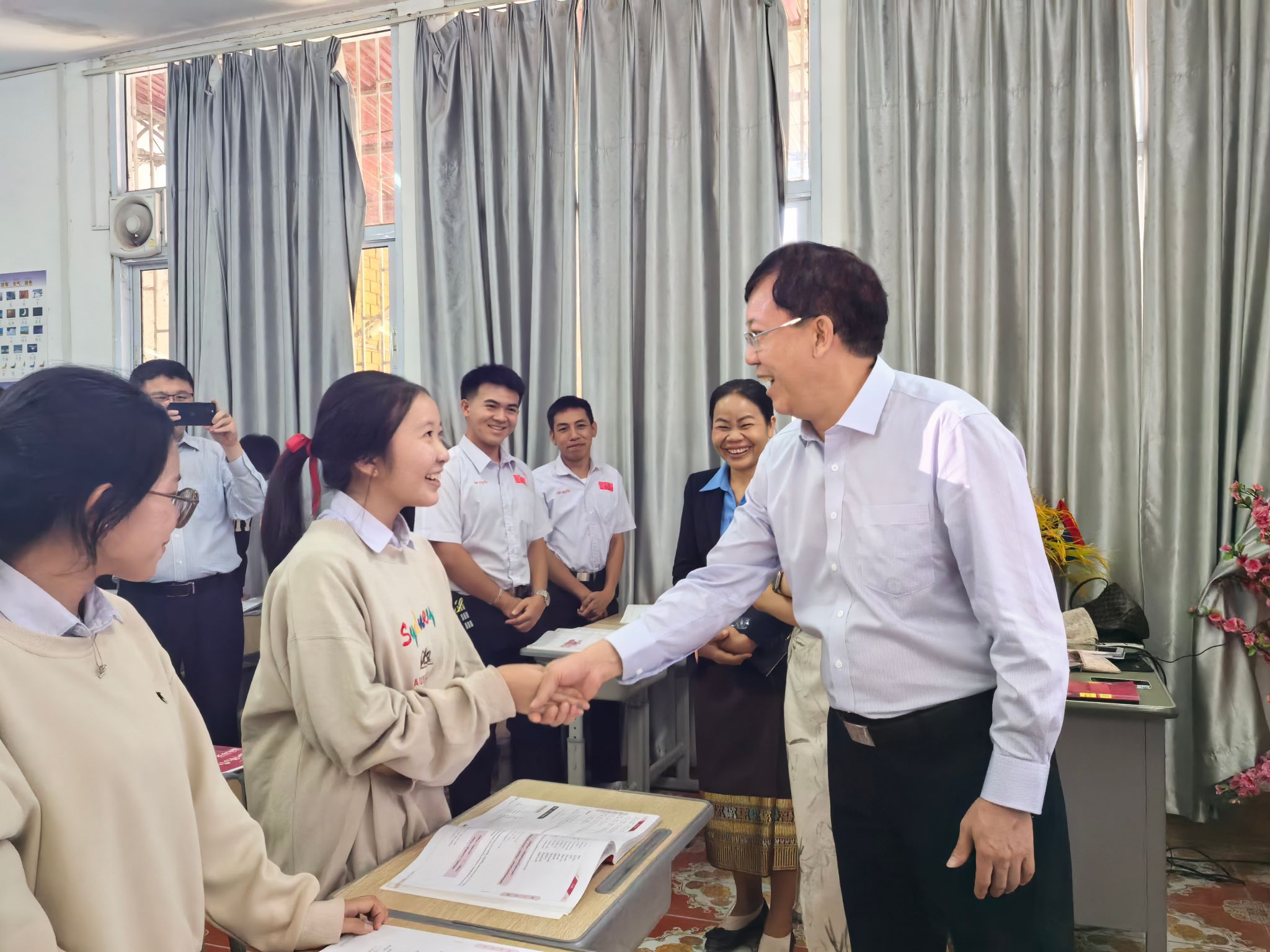 唐平秋与老挝万象中学孔子课堂学生亲切交流