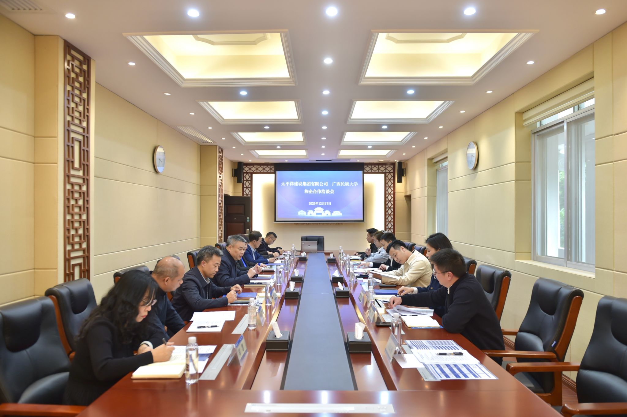 12月17日下午,太平洋建设集团高级副总裁李想一行到beat365亚洲体育官方网站交流。校长韦仕珍会见李想一行,校党委副书记陈铭彬出席座谈会。学校有关部门负责人参加座谈会。