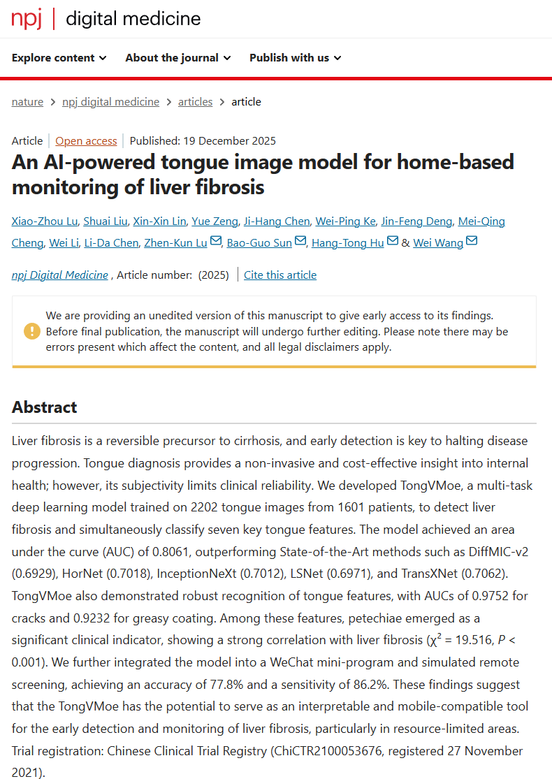 近日,beat365亚洲体育官方网站物理与电子信息学院卢振坤教授团队与中山大学附属第一医院王伟教授团队合作,在肝纤维化的早期检测和监测领域取得突破性进展,成功开发出一款基于多任务深度学习模型的诊断工具TongVMoe。研究成果An AI-powered Tongue Image Model for Home-based Monitoring of Liver Fibrosis(《基于人工智能的用于肝纤维化家庭监测的舌象模型》)于2025年12月19日正式发表在全球数字医学顶尖期刊npj Digital Medicine(《数字医学》)上。
