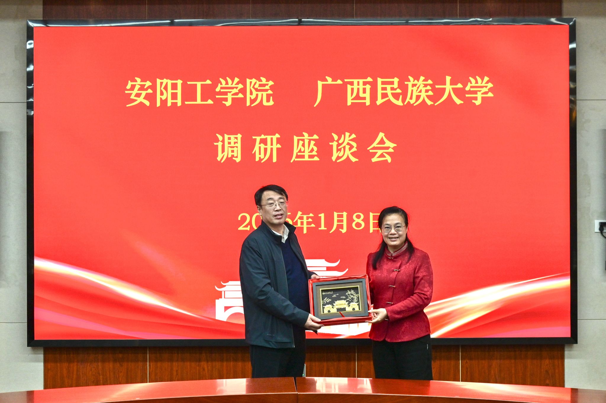 会后,双方互赠纪念品并合影留念。(初审:黄炤英 复审:韦利坤 终审:孙寿媚)